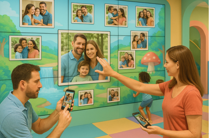 Por ejemplo, los clientes pueden usar su teléfono inteligente para agregar fotos a su "muro inteligente". Luego puede cambiar su tamaño, ajustarlos y moverlos por la habitación. Ahora tienes un cliente con tu aplicación instalada en su teléfono. La aplicación les recordará que vuelvan de visita, mostrándoles fotos del gran momento que pasaron con sus hijos y otras técnicas de marketing, ¡todo gracias a la temática interactiva del patio interior!