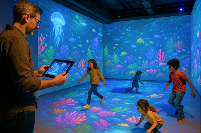 La proyección de vídeo realmente da vida al patio de recreo. Una vez que se haya decidido un tema gráfico, el equipo de temática interactiva intervendrá para agregar pantallas y superficies de video, materiales de proyección y efectos de iluminación a lo largo de todo el proyecto.
