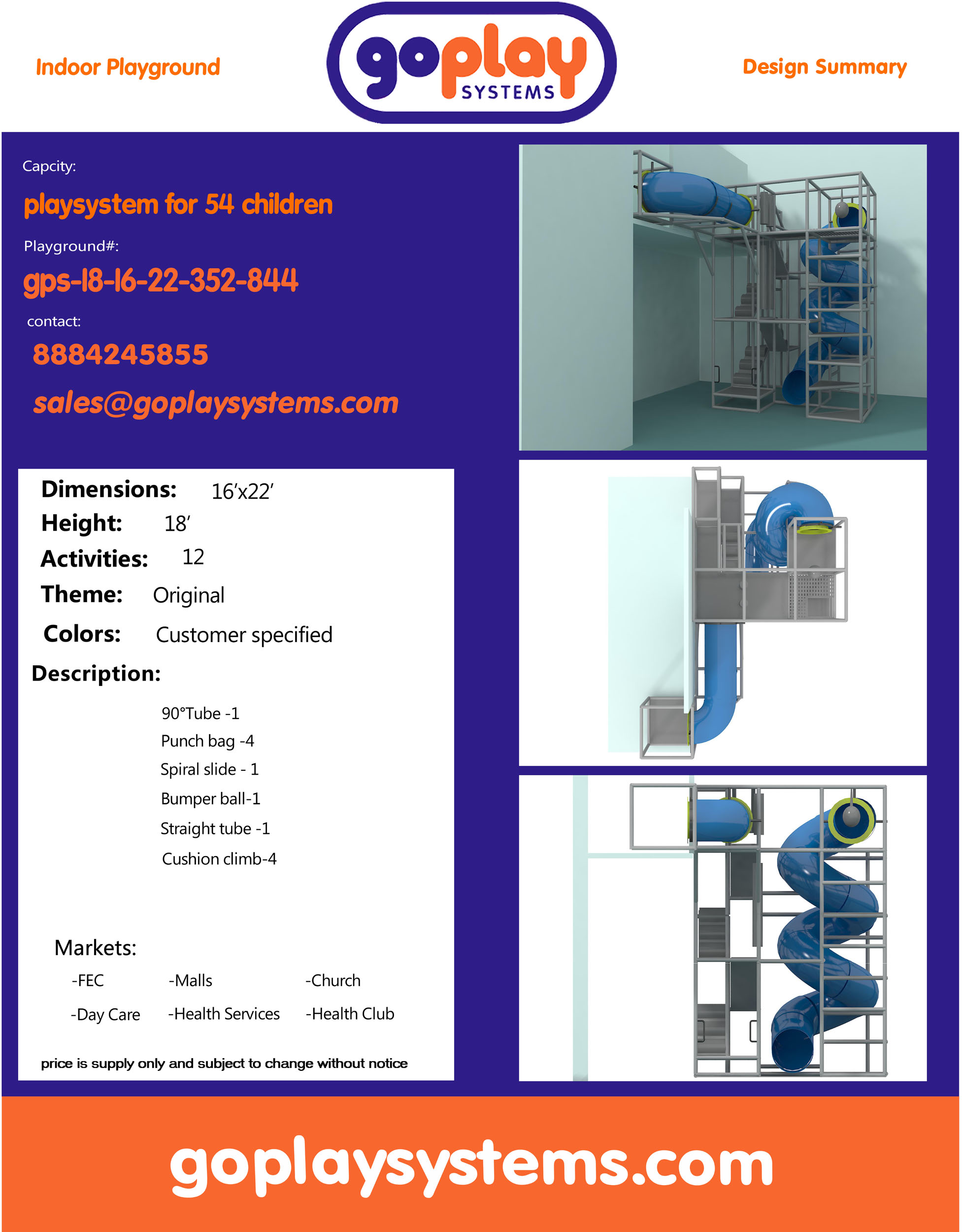 Compre equipo de juegos para interiores GPS844 – 18 pies de alto x 16 pies de ancho 22 pies.