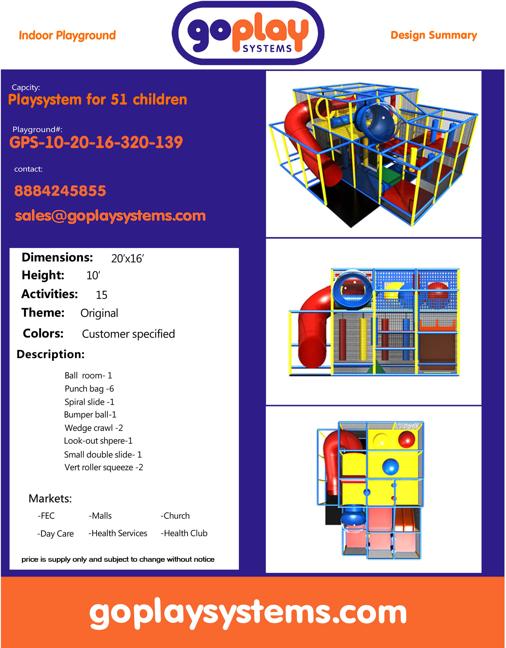 Equipo de juegos para interiores de nueva creación GPS139 – (tamaño del sistema de juegos para interiores) 10 pies de alto x 16 pies de ancho x 20 pies.
