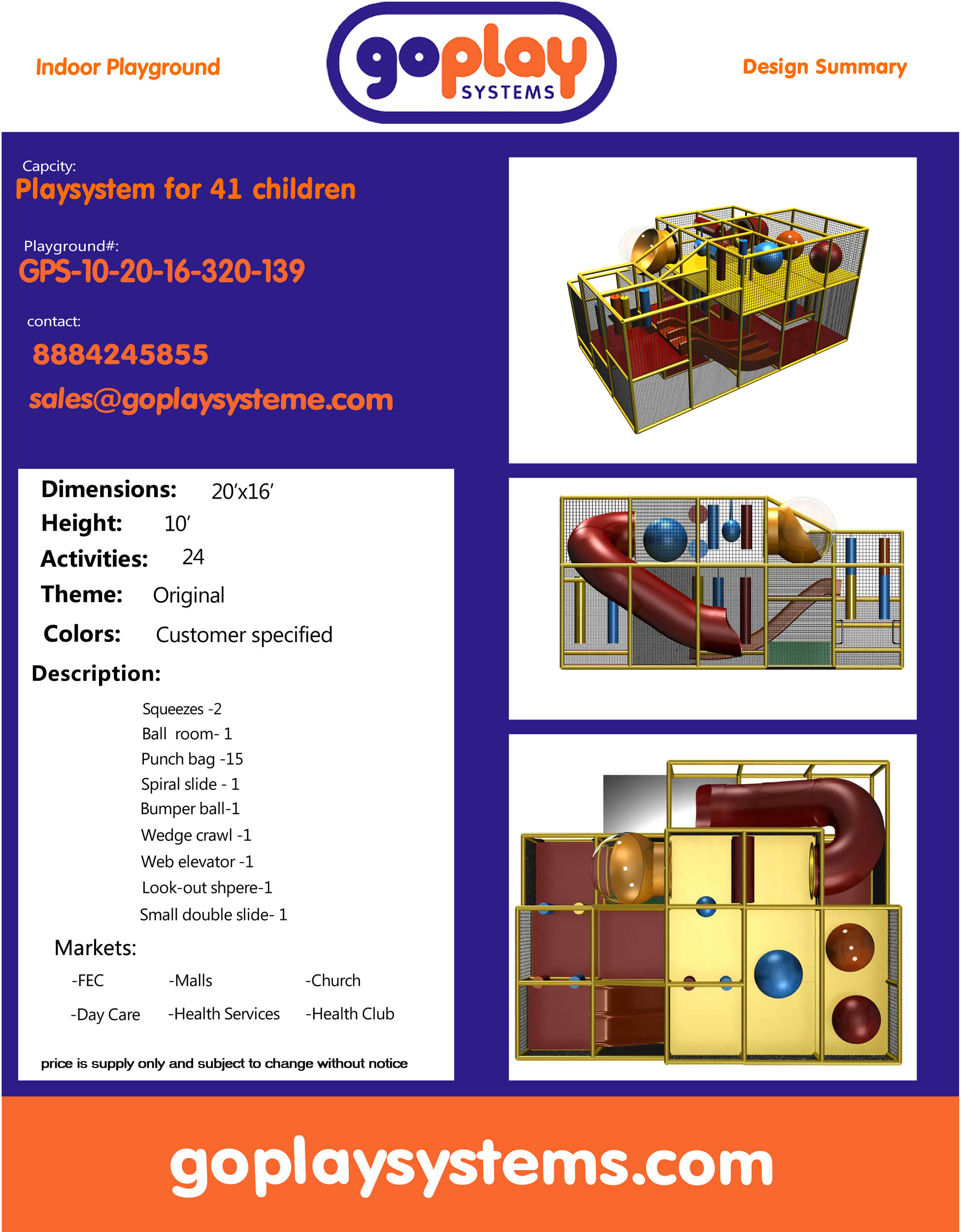 El parque infantil interior GPS139 es un sistema de juego interior personalizado para niños de tres a doce años. La unidad de juego blando mide 6,1 m de ancho por 3,0 m de alto y 4,8 m de largo. El espacio mínimo requerido para este equipo de juego infantil es de aproximadamente 8,9 m de ancho, 3,6 m de techo y 6,7 m de largo. Parque infantil interior de tamaño pequeño.