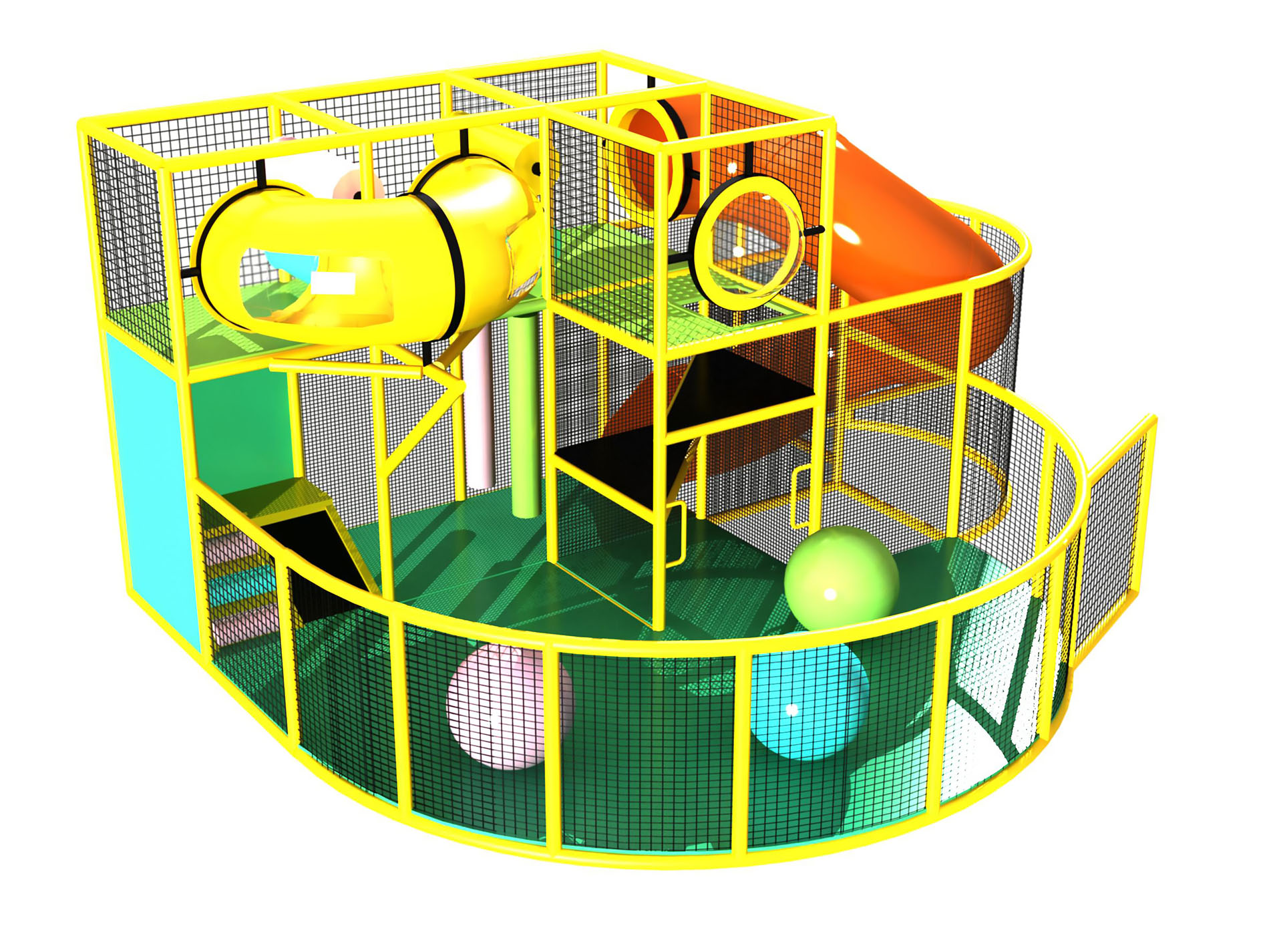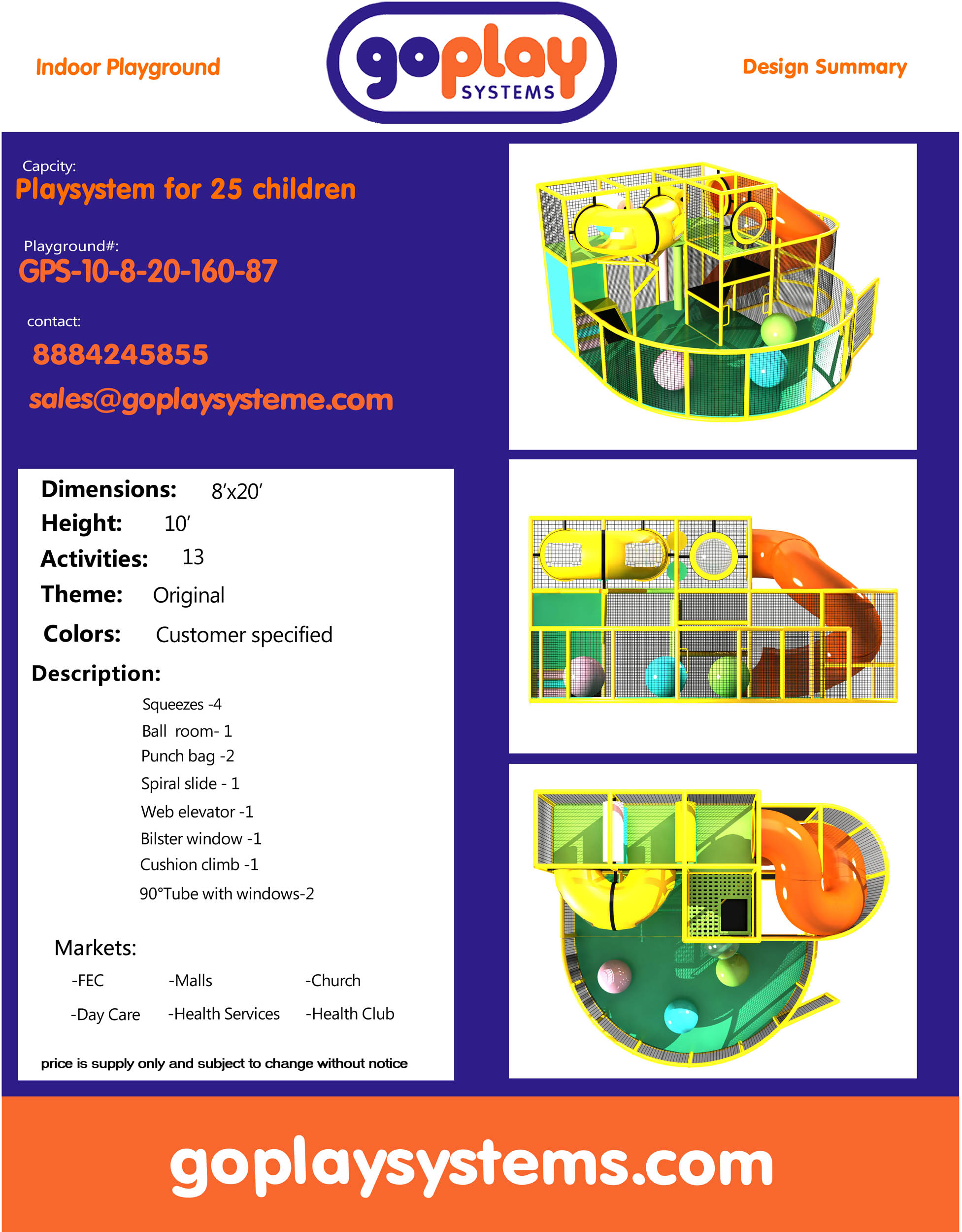 El parque infantil interior GPS87 es un sistema de juego interior personalizado para niños de tres a doce años. La unidad de juego blando mide 2,4 m de ancho por 3 m de alto y 6 m de largo. El espacio mínimo requerido para este equipo de juego infantil es de aproximadamente 4,2 m de ancho, 3,6 m de techo y 8,9 m de largo. Parque infantil interior de tamaño pequeño.
