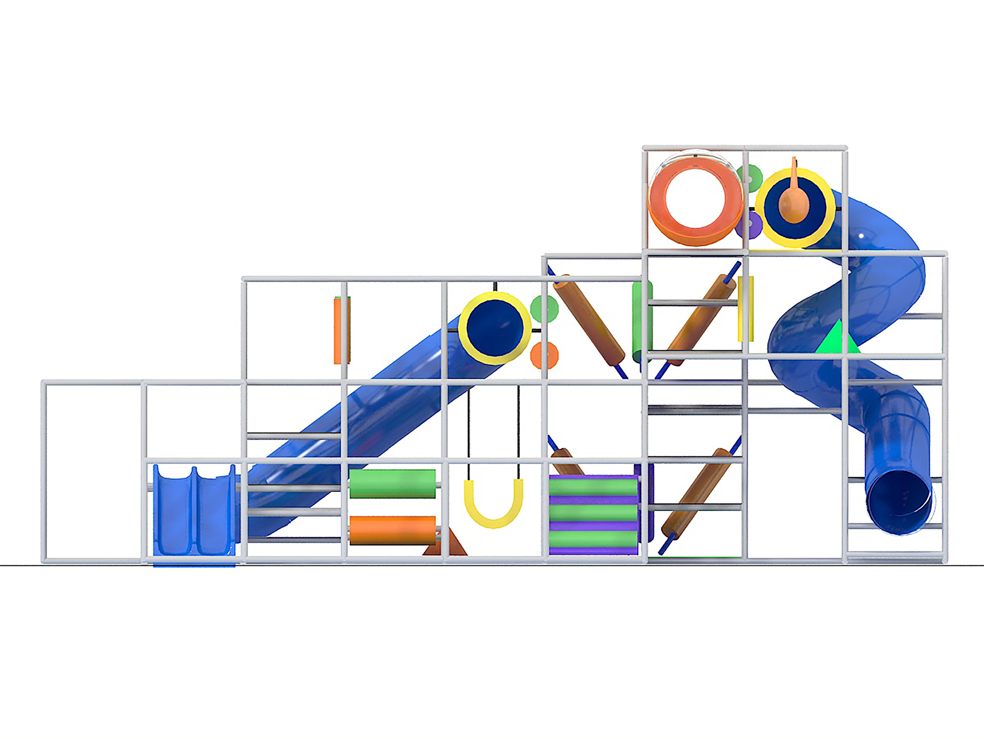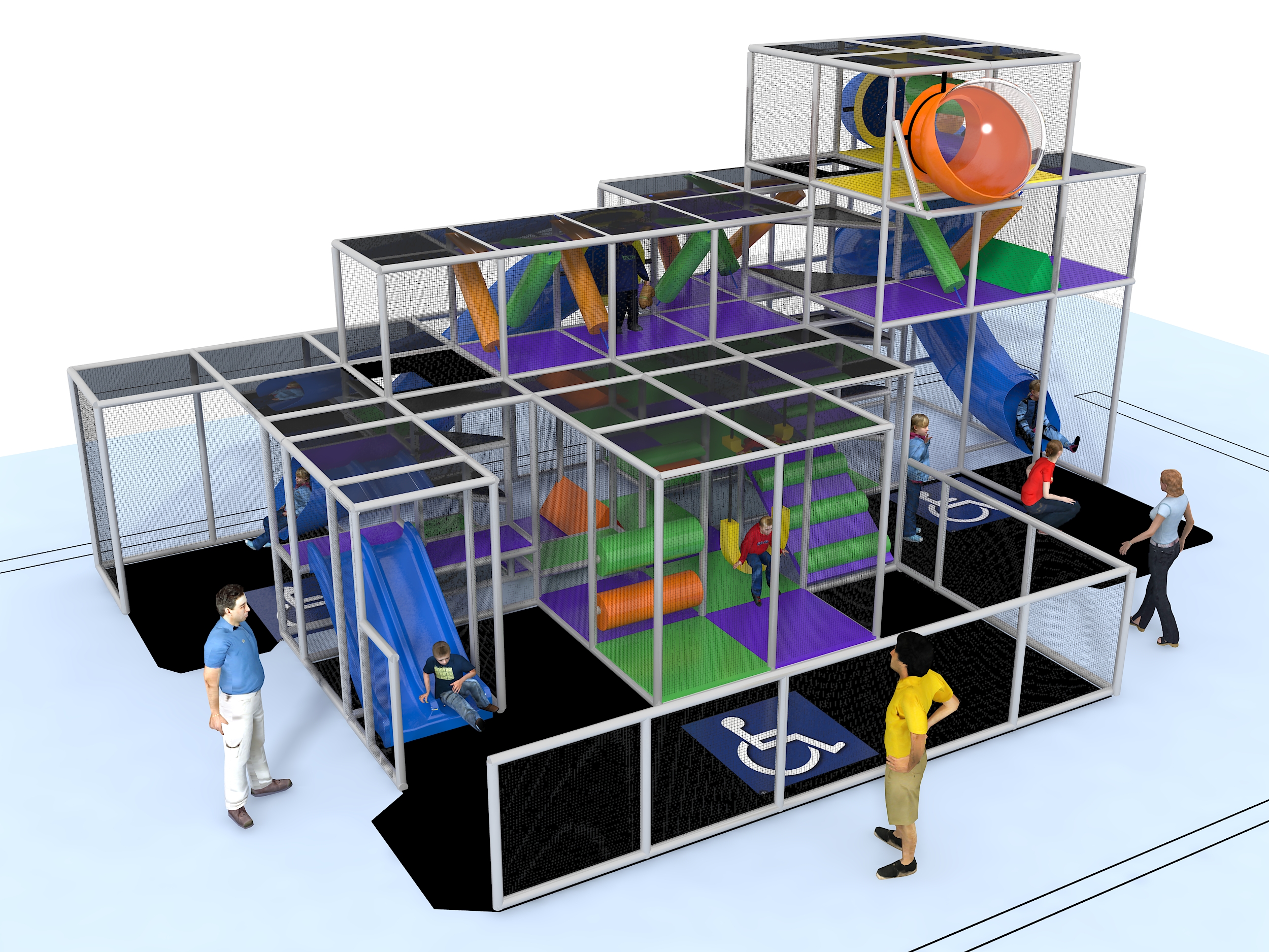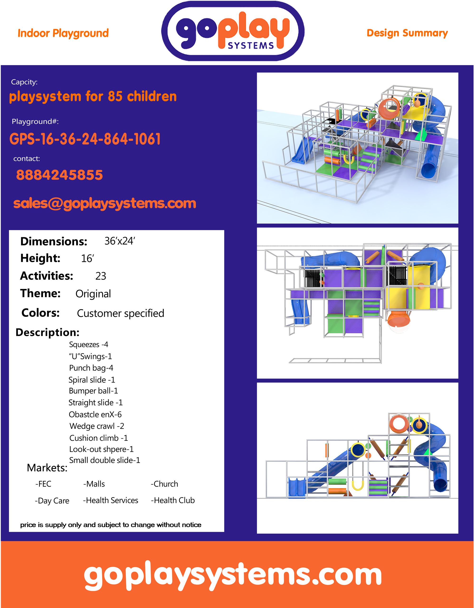 El parque infantil interior GPS1061 es un sistema de juego interior personalizado para niños de tres a doce años. La unidad de juego blando mide 11,8 m de ancho por 4,8 m de alto y 7,3 m de largo. El espacio mínimo requerido para este equipo de juego infantil es de aproximadamente 13,8 m de ancho, 5,5 m de techo y 9,1 m de largo. Superficie total: 80 m². Parque infantil interior de tamaño mediano.