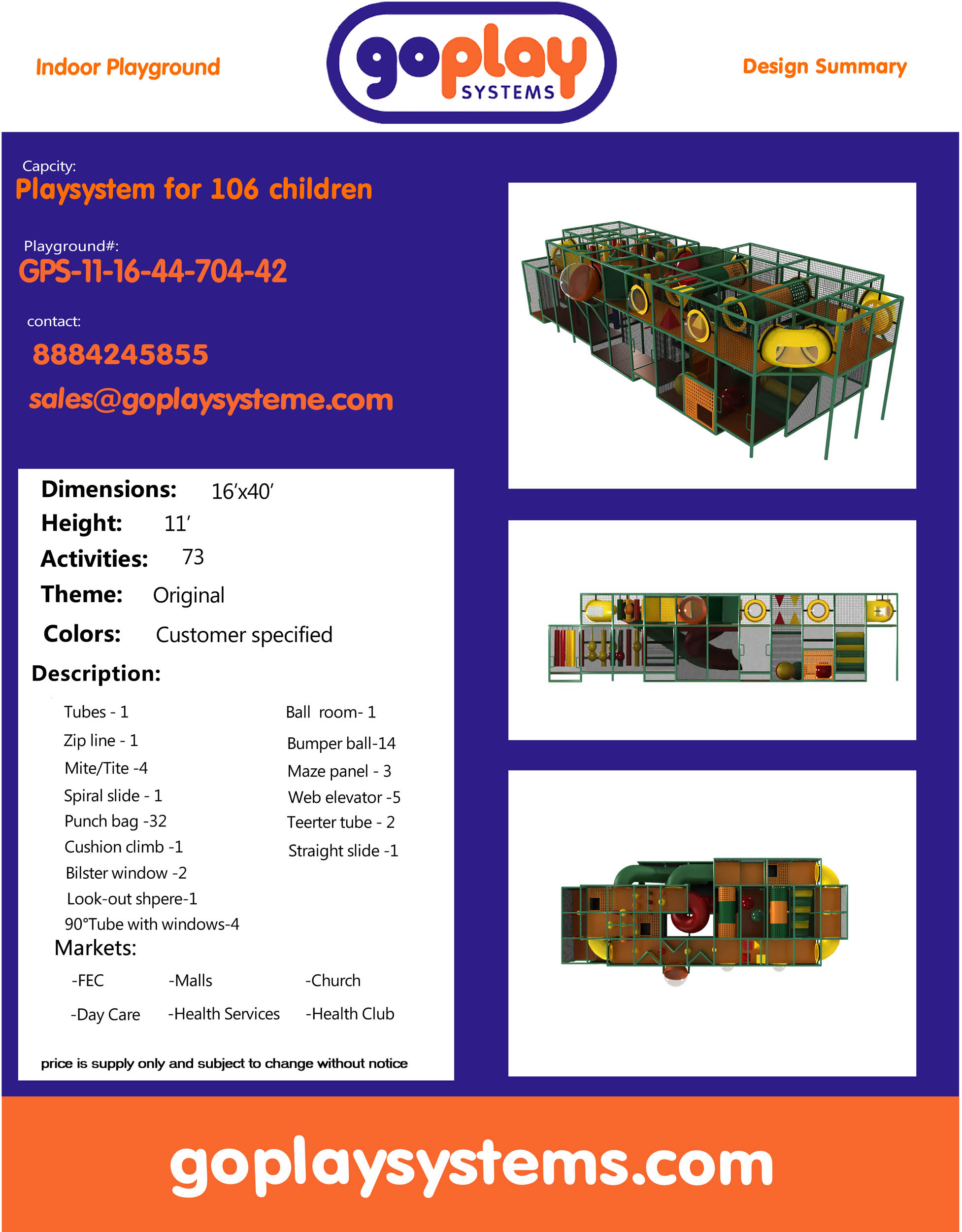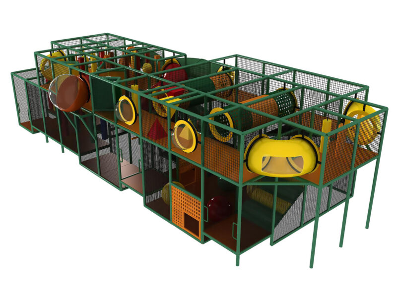 El parque infantil interior GPS42 es un sistema de juego interior personalizado para niños de tres a doce años. La unidad de juego blando mide 4,8 m de ancho por 3,3 m de alto y 13,4 m de largo. El espacio mínimo requerido para este equipo de juego infantil es de aproximadamente 6,7 m de ancho, 4,9 m de techo y 15,2 m de largo. Parque infantil interior de tamaño mediano.