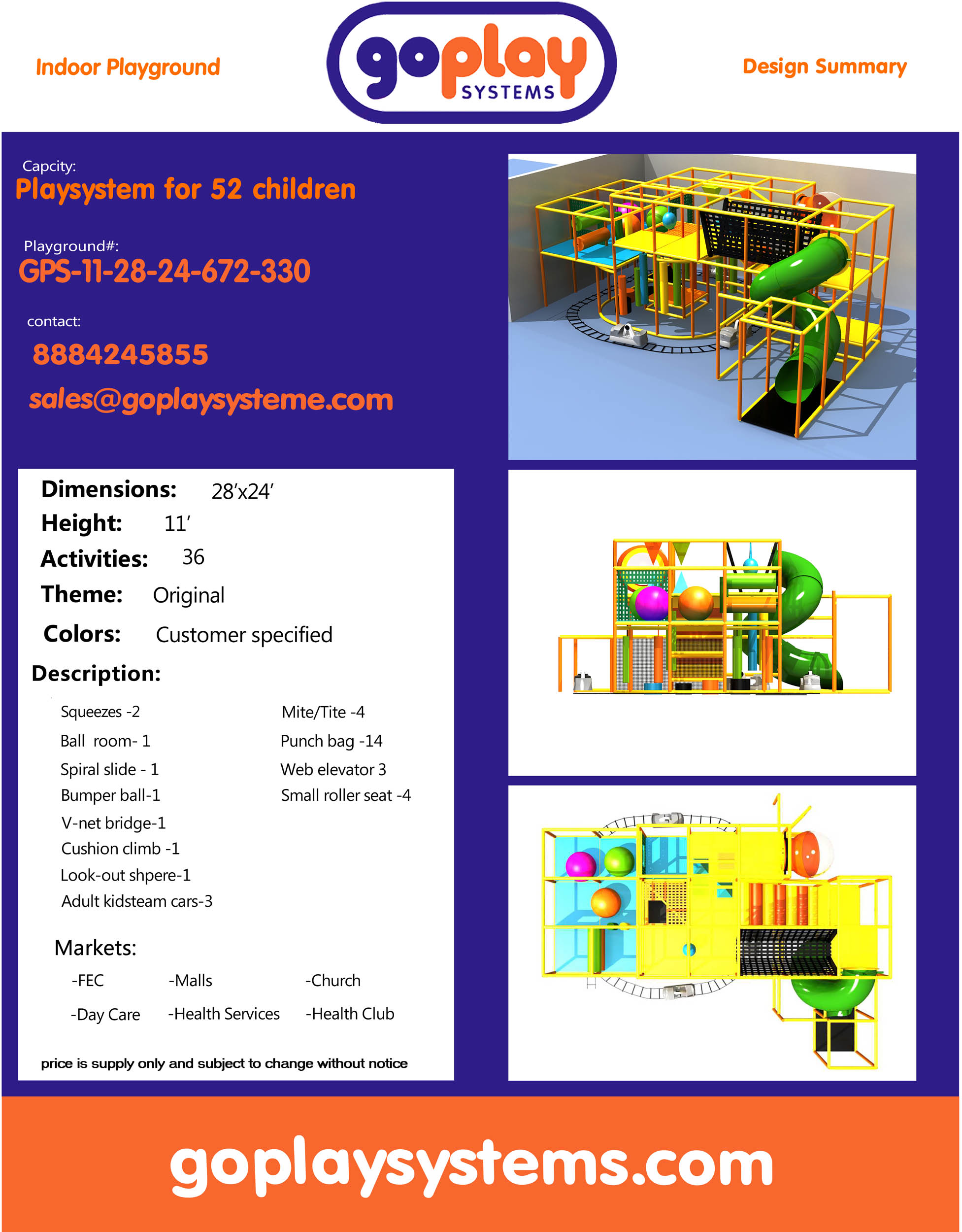 El parque infantil interior GPS330 es un sistema de juego interior personalizado para niños de tres a doce años. La unidad de juego blando mide 8,5 m de ancho por 3,3 m de alto y 7,3 m de largo. El espacio mínimo requerido para este equipo de juego infantil es de aproximadamente 10,3 m de ancho, 4,9 m de techo y 9,1 m de largo. Parque infantil interior de tamaño mediano.