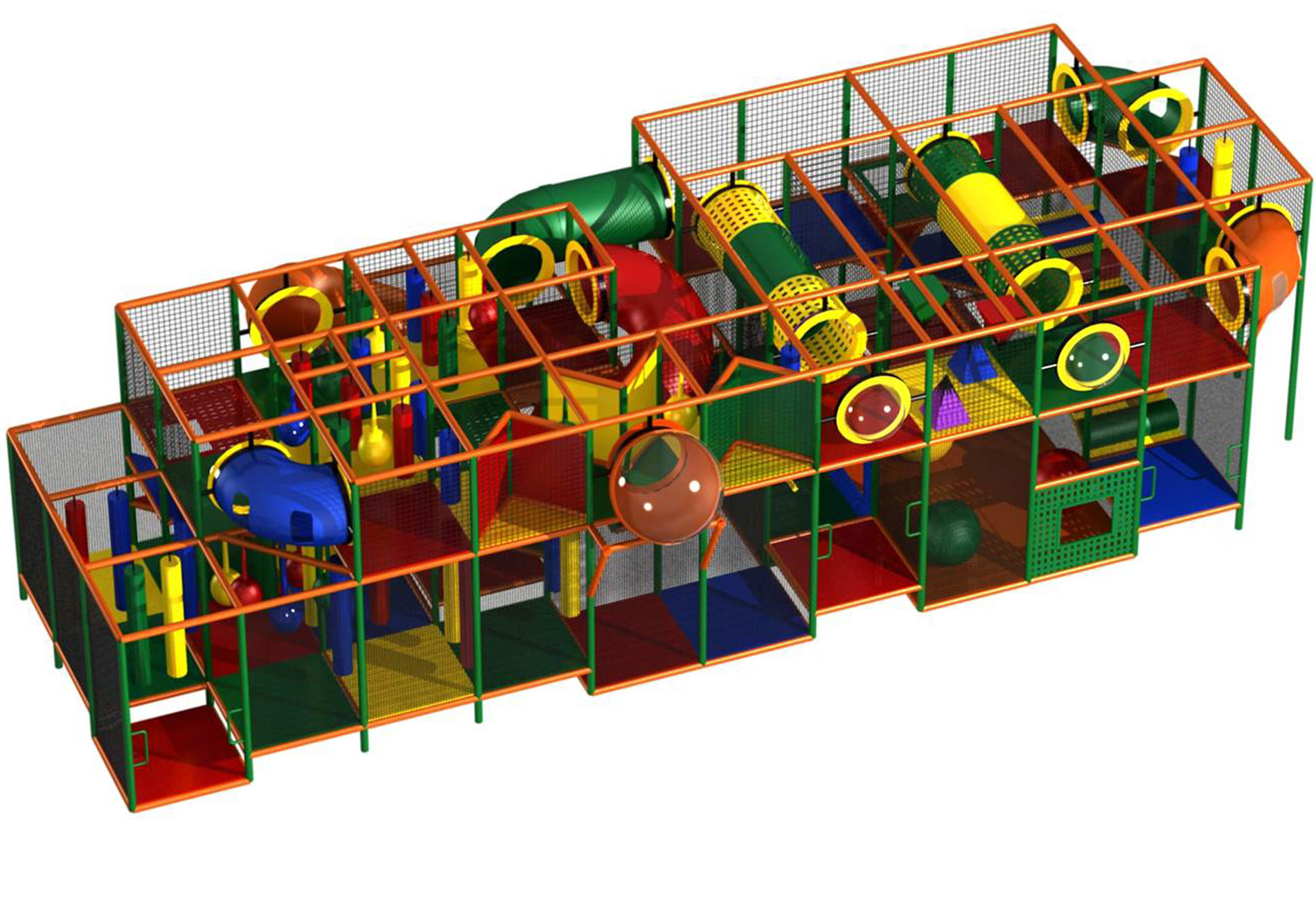El parque infantil interior GPS42 es un sistema de juego interior personalizado para niños de tres a doce años. La unidad de juego blando mide 13,4 m de ancho por 3,3 m de alto y 4,8 m de largo. El espacio mínimo requerido para este equipo de juego infantil es de aproximadamente 15,2 m de ancho, con un techo de 4,9 m y 6,7 m de largo. Parque infantil interior de gran tamaño.