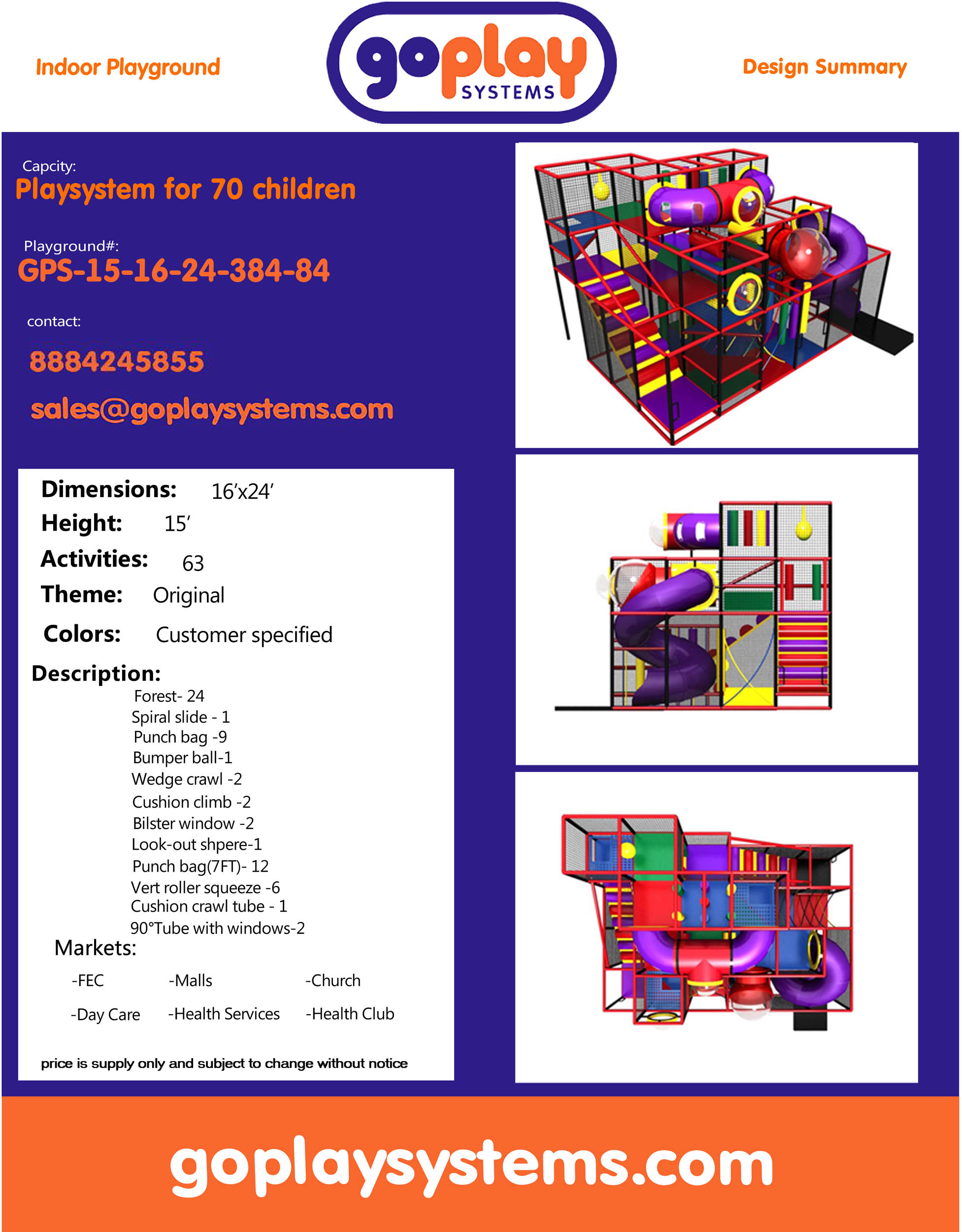 El parque infantil interior GPS84 es un parque infantil modular blando, diseñado a medida, para niños de tres a doce años. El sistema de juego interior mide 4,8 m de ancho por 4,5 m de alto y 7,3 m de largo. El espacio mínimo requerido para este parque infantil interior es de aproximadamente 6,7 m de ancho, 5,2 m de techo y 9,1 m de largo. El parque infantil interior de tamaño mediano.
