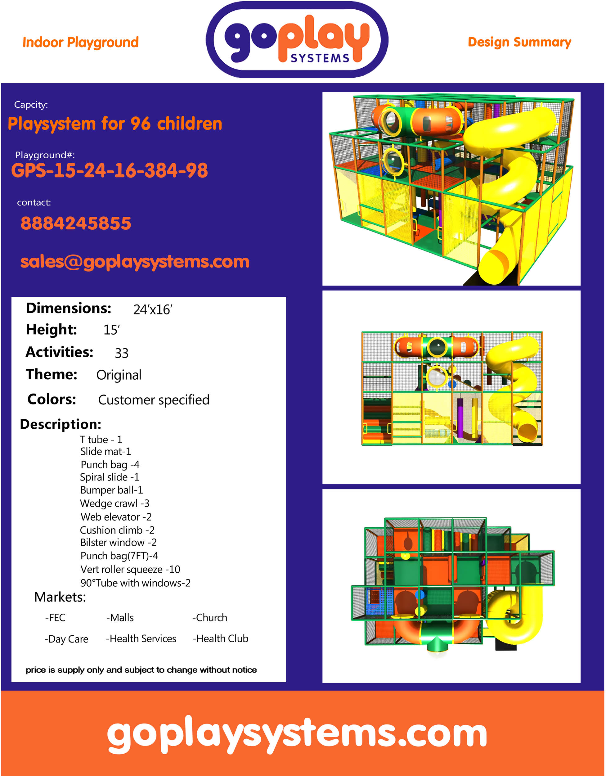 El parque infantil interior GPS98 es un parque infantil modular blando, diseñado a medida, para niños de tres a doce años. El sistema de juego interior mide 4,8 m de ancho por 4,5 m de alto y 7,3 m de largo. El espacio mínimo requerido para este parque infantil interior es de aproximadamente 6,7 m de ancho, 5,2 m de techo y 9,1 m de largo. El parque infantil interior de tamaño mediano.