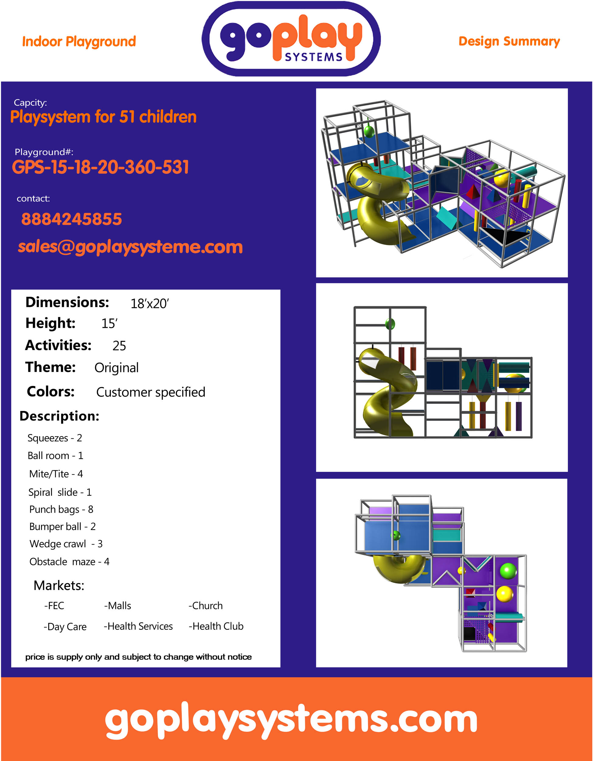 El parque infantil interior GPS531 es un parque infantil modular blando, diseñado a medida, para niños de tres a doce años. El sistema de juego interior mide 5,5 m de ancho por 4,5 m de alto y 6,1 m de largo. El espacio mínimo requerido para este parque infantil interior es de aproximadamente 7,3 m de ancho, con un techo de 5,2 m y 8,9 m de largo. Parque infantil interior de tamaño mediano.