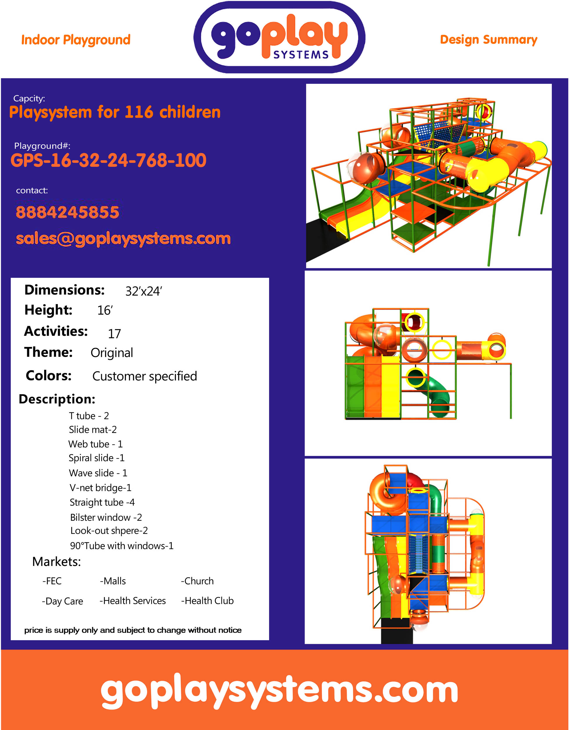 El parque infantil interior GPS100 es un sistema de juego interior a medida para niños de tres a doce años. El área de juego suave mide 9,7 m de ancho por 4,8 m de alto y 7,3 m de largo. El espacio mínimo requerido para este parque infantil interior es de aproximadamente 11,5 m de ancho, 5,5 m de techo y 9,1 m de largo. Parque infantil interior de tamaño mediano.