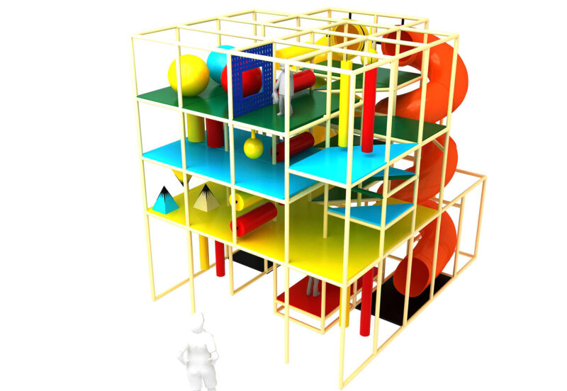 El parque infantil interior GPS256 es un sistema de juego interior a medida para niños de tres a doce años. El área de juego suave mide 4,8 m de ancho por 5,8 m de alto y 6,1 m de largo. El espacio mínimo requerido para este parque infantil interior es de aproximadamente 6,7 m de ancho, 6,4 m de techo y 8,9 m de largo. Parque infantil interior de tamaño mediano. Este parque infantil es ideal para edificios o almacenes con techos altos.
