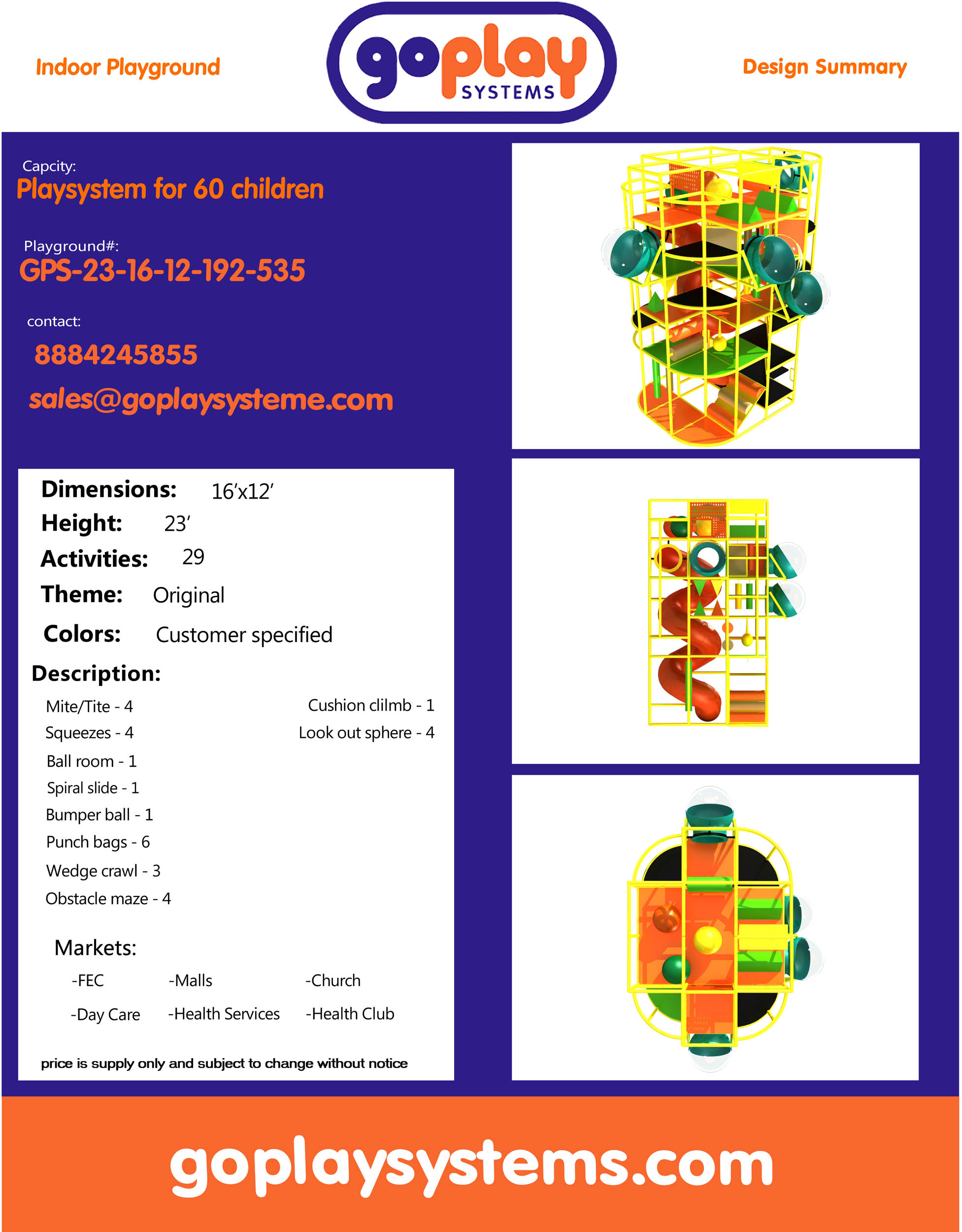El parque infantil interior GPS535 es una unidad de juego blando interior hecha a medida para niños de tres a doce años. El sistema de juego interior mide 4,8 m de ancho por 7,0 m de alto y 3,6 m de largo. El espacio mínimo requerido para este parque infantil interior es de aproximadamente 6,7 m de ancho, 7,6 m de techo y 5,4 m de largo. Parque infantil interior de gran tamaño. Este parque infantil es ideal para edificios o almacenes con techos altos.