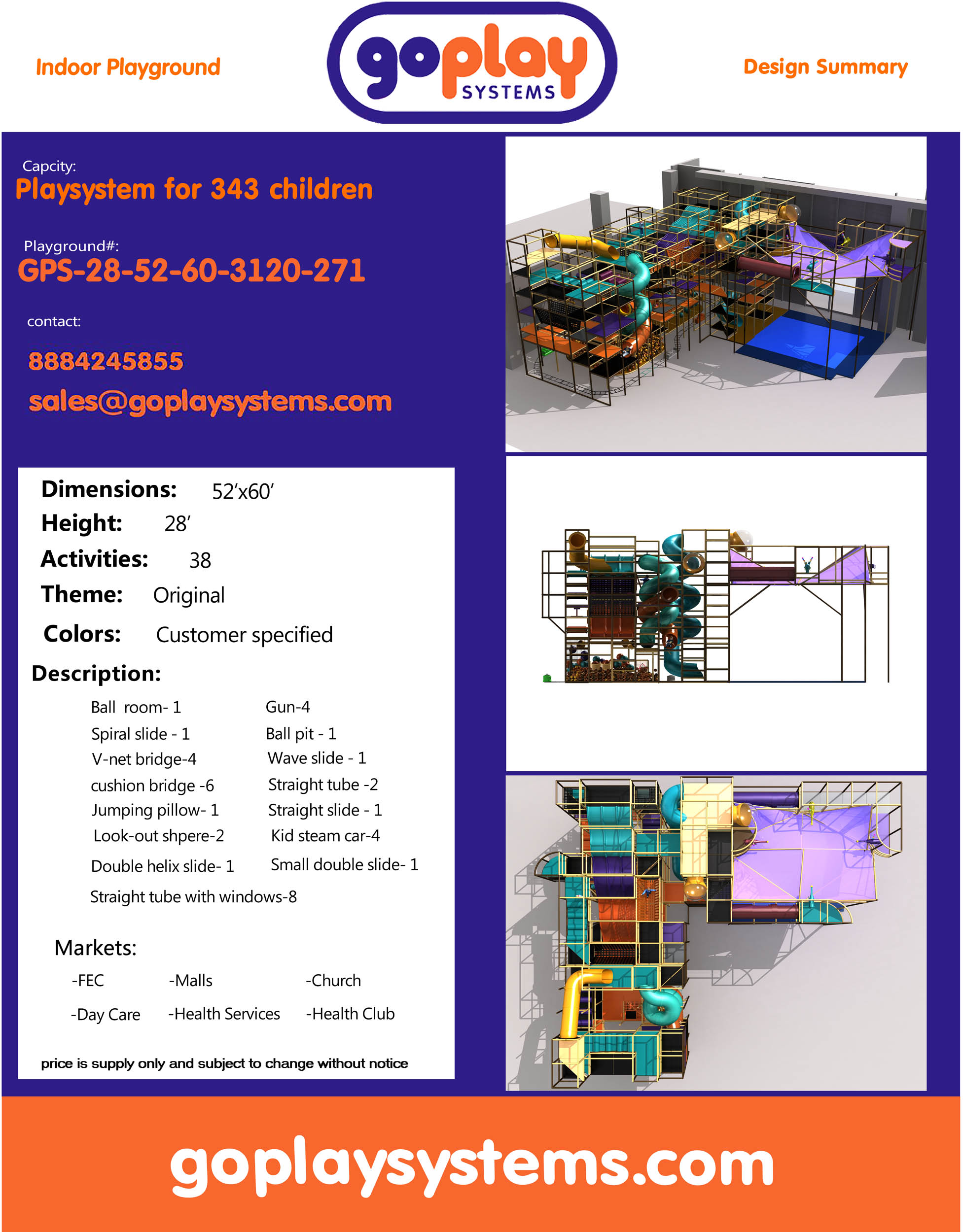 El parque infantil interior GPS271 es una unidad de juego blando interior hecha a medida para niños de tres a doce años. El sistema de juego interior mide 15,8 m de ancho por 8,5 m de alto y 18,2 m de largo. El espacio mínimo requerido para este parque infantil interior es de aproximadamente 17,5 m de ancho, con un techo de 9,1 m y 20,3 m de largo. Parque infantil interior extragrande. Este parque infantil es ideal para edificios o almacenes con techos altos.