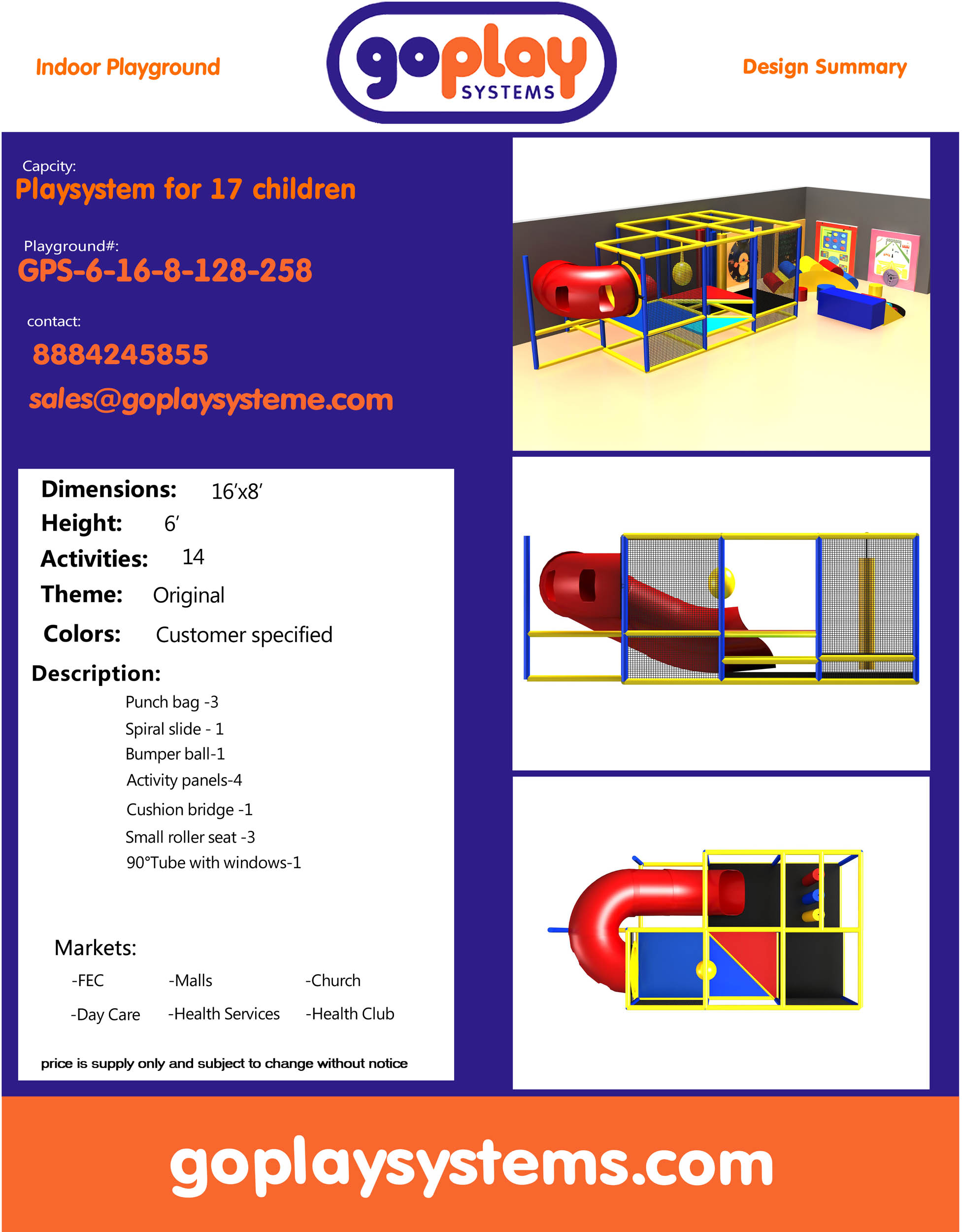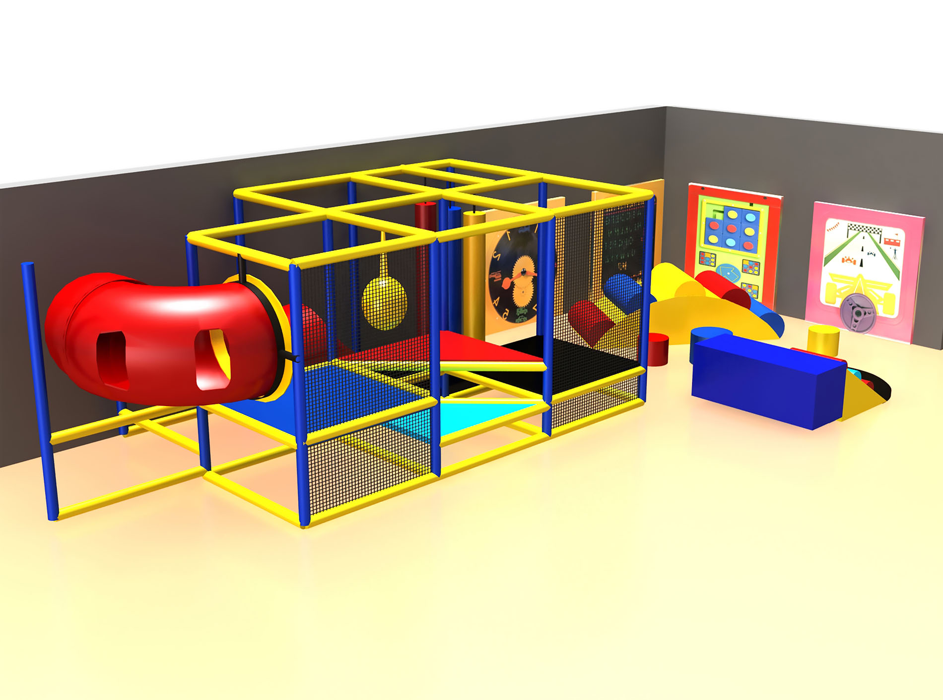 El parque infantil interior GPS258 es una unidad de juego blando interior hecha a medida para niños de tres a doce años. El sistema de juego interior mide 4,8 m de ancho por 1,8 m de alto y 2,4 m de largo. El espacio mínimo requerido para este parque infantil interior es de aproximadamente 6,7 m de ancho, con un techo de 2,4 m y 4,2 m de largo. Parque infantil interior de tamaño pequeño. El precio no incluye juegos para montar ni gatear.
