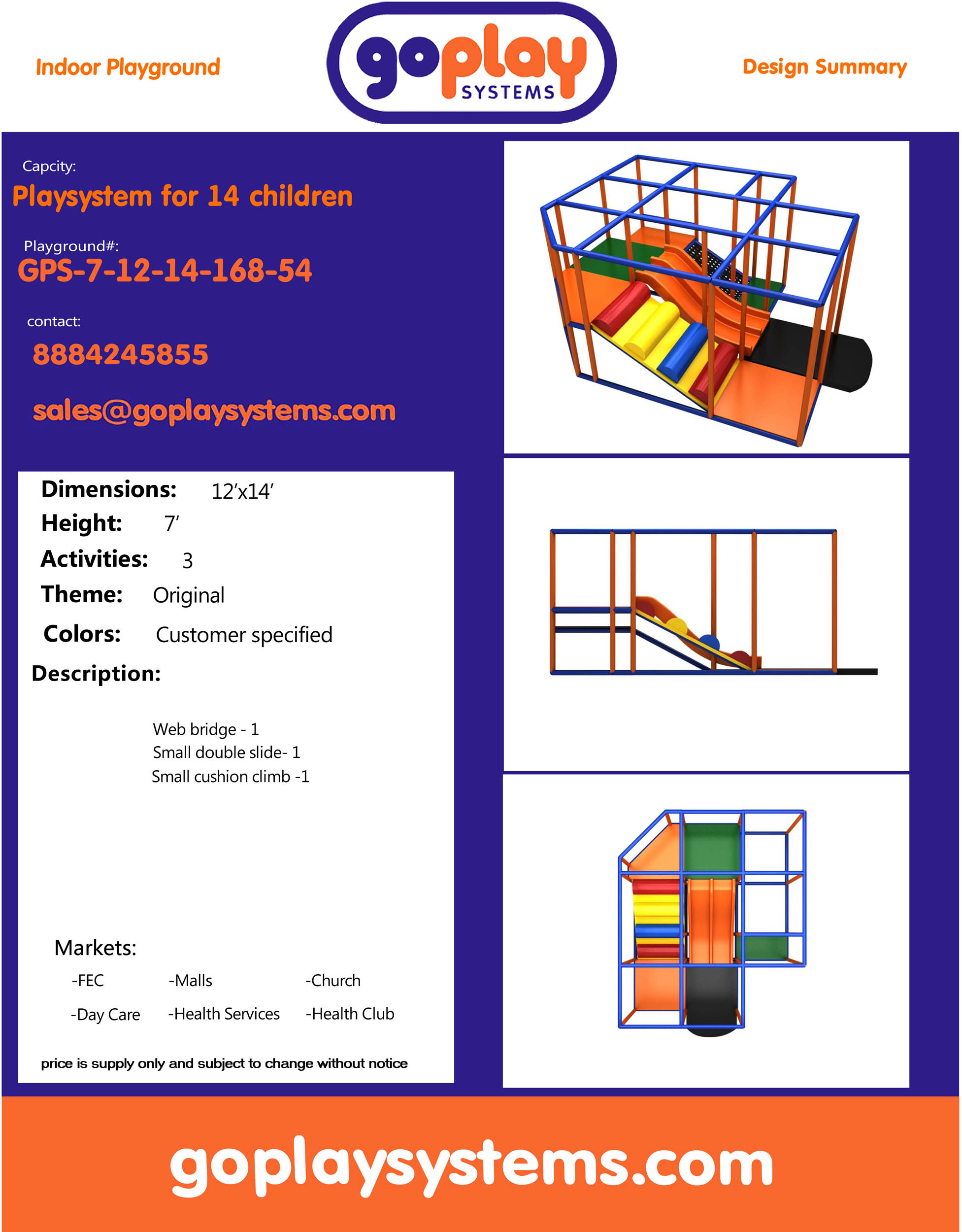 El parque infantil interior GPS54 es una unidad de juego blando interior hecha a medida para niños de tres a doce años. El sistema de juego interior mide 3,6 m de ancho por 2,1 m de alto y 4,2 m de largo. El espacio mínimo requerido para este parque infantil interior es de aproximadamente 5,5 m de ancho, con un techo de 2,7 m y 6 m de largo. Parque infantil interior de tamaño pequeño. No incluye tobogán.