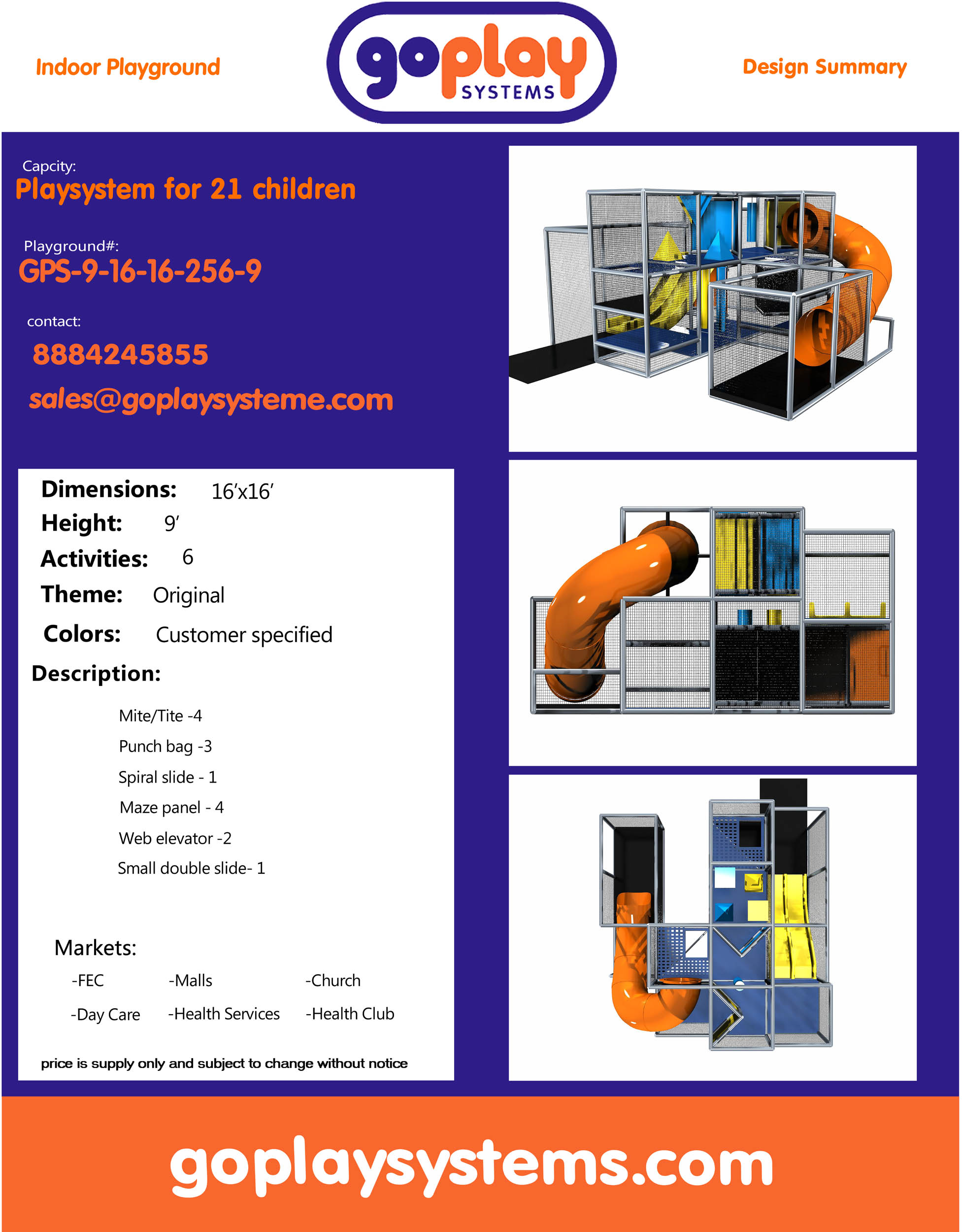 El parque infantil interior GPS9 es una unidad de juego blando interior hecha a medida para niños de tres a doce años. El sistema de juego interior mide 4,8 m de ancho por 2,7 m de alto y 4,8 m de largo. El espacio mínimo requerido para este parque infantil interior es de aproximadamente 6,7 m de ancho, 3,3 m de techo y 6,7 m de largo. Parque infantil interior de tamaño pequeño. Este parque infantil es ideal para habitaciones de una sola planta con techo bajo.