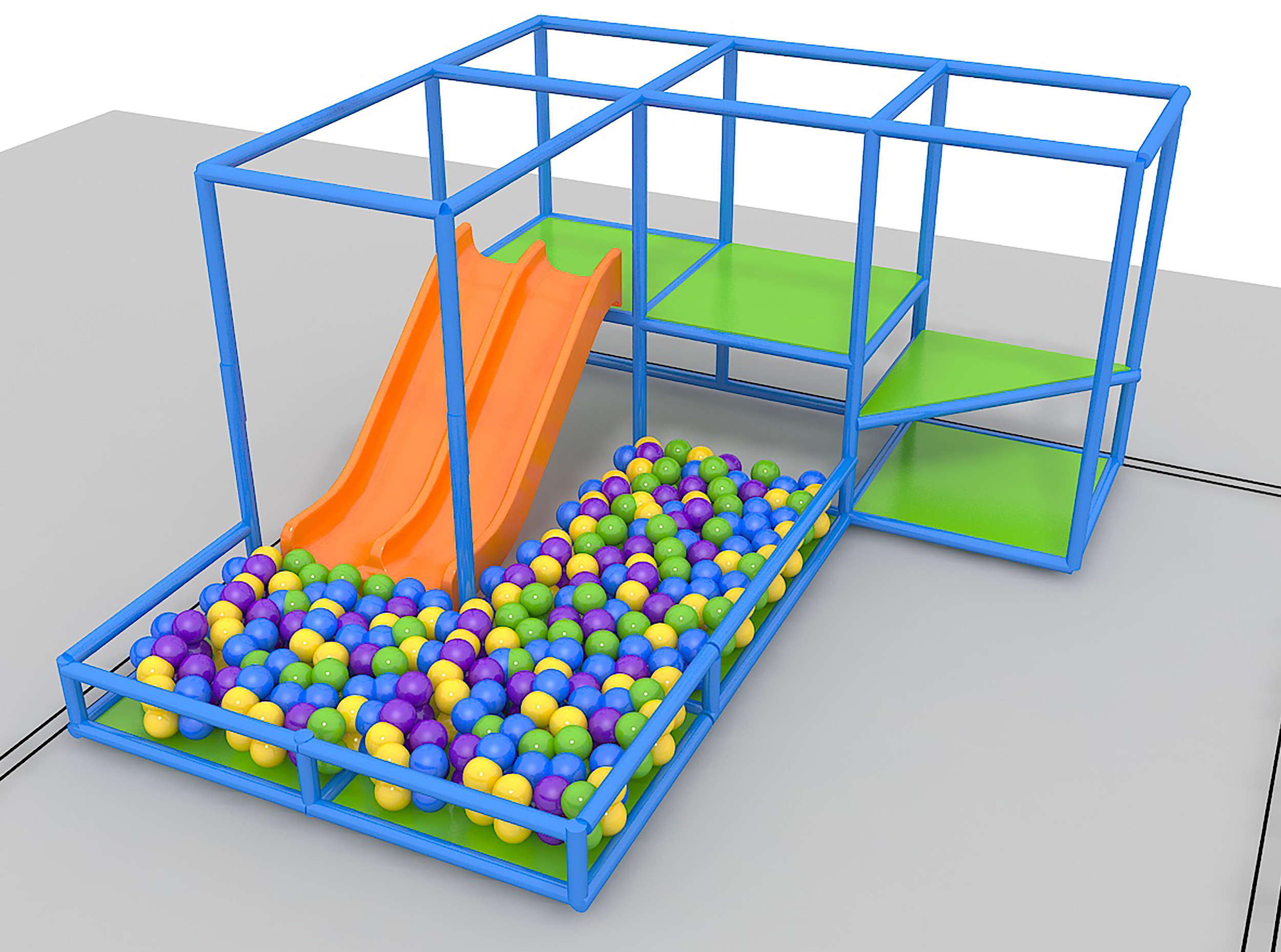 El parque infantil interior GPS095 es un sistema modular de juego blando, diseñado a medida y desarrollado para niños de forma segura. El sistema mide 3,6 m de ancho por 2,1 m de alto y 4,2 m de largo. El espacio interior mínimo requerido para este parque infantil es de aproximadamente 5,5 m de ancho, con un techo de 2,7 m y 6 m de largo. Parque infantil interior de tamaño mediano.