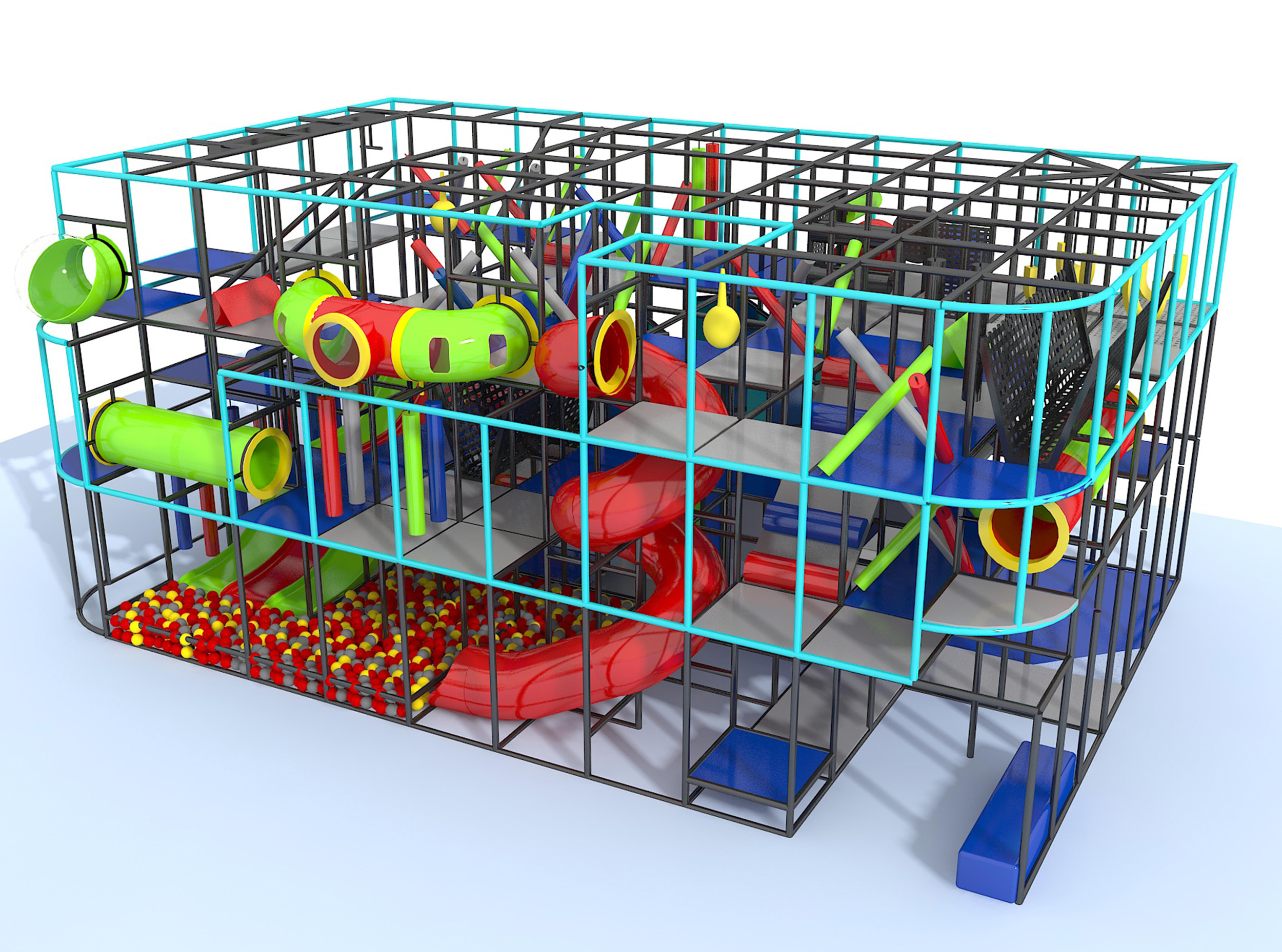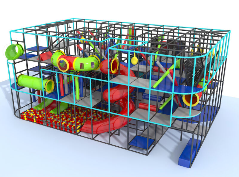 El parque infantil interior GPS011 es un sistema modular de juego blando, diseñado a medida y desarrollado para niños de forma segura. El sistema mide 13,4 m de ancho por 5,8 m de alto y 8,5 m de largo. El espacio interior mínimo requerido para este parque infantil es de aproximadamente 15,2 m de ancho, con un techo de 6,4 m y 10,3 m de largo. Parque infantil interior de tamaño mediano.