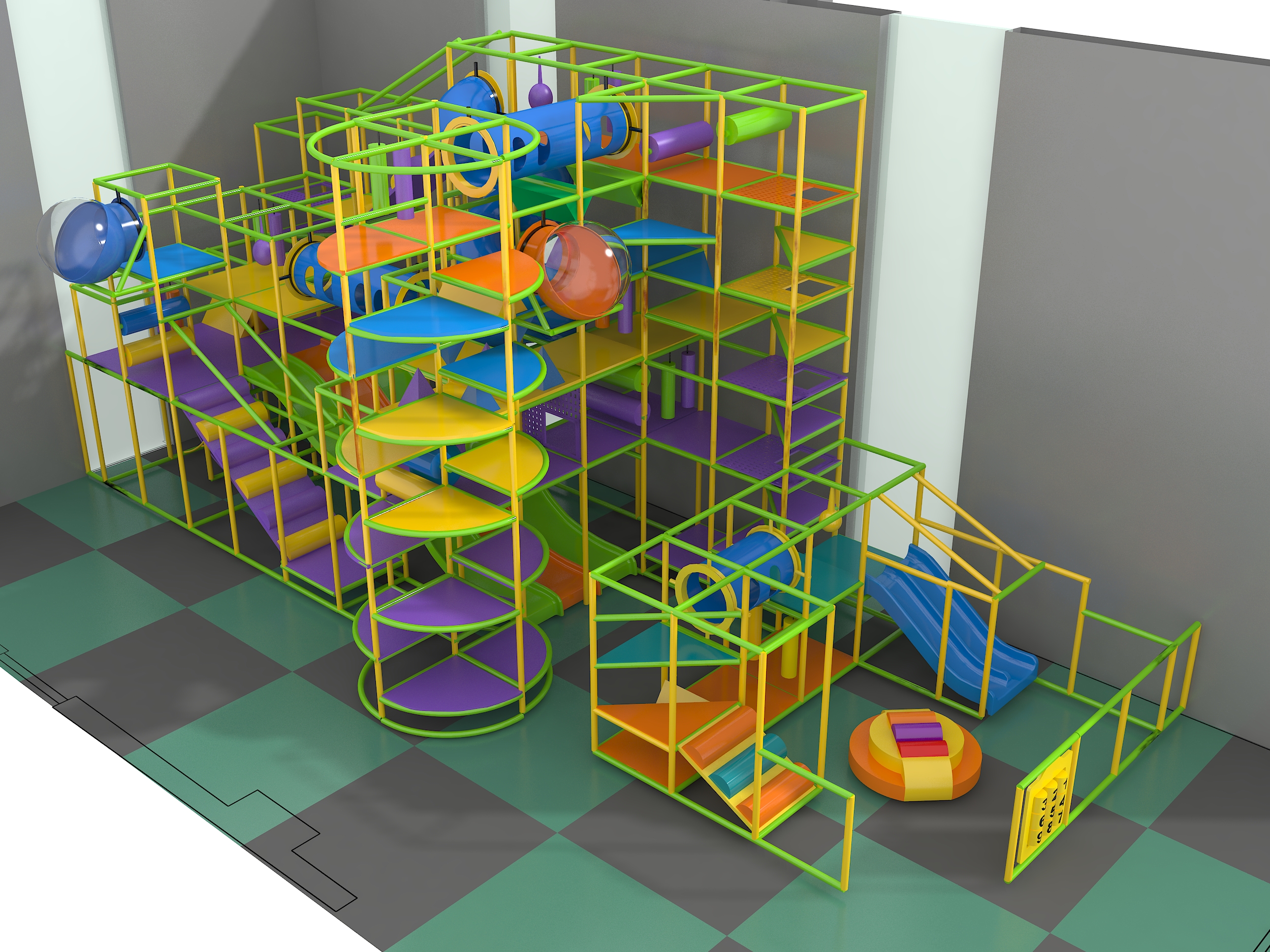 El parque infantil interior GPS1195 es un sistema de juego interior personalizado para niños de tres a doce años. La unidad de juego blando mide 15,8 m de ancho por 7,0 m de alto y 6,1 m de largo. El espacio mínimo requerido para este equipo de juego infantil es de aproximadamente 17,5 m de ancho, con un techo de 7,6 m y 8,9 m de largo. Superficie total: 1040 pies cuadrados. Parque infantil interior de gran tamaño.