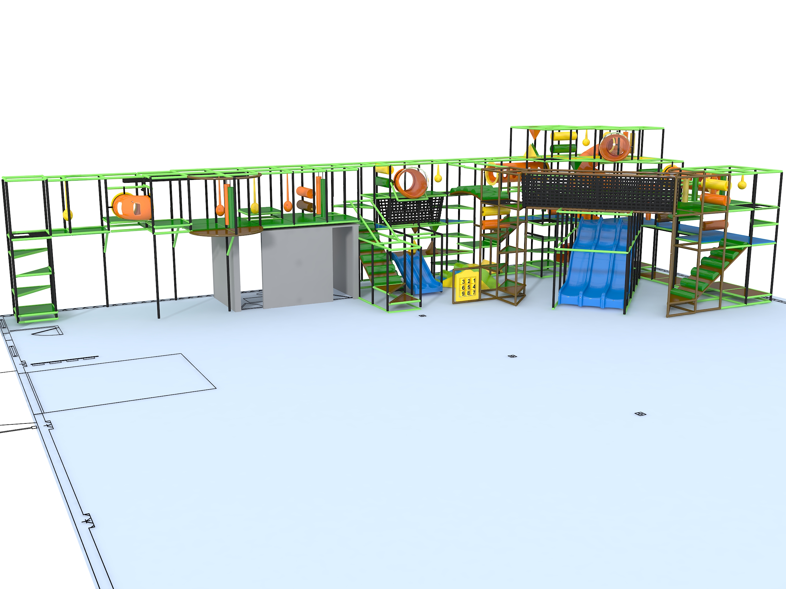 El parque infantil interior GPS1219 es un sistema de juego interior personalizado para niños de tres a doce años. La unidad de juego blando mide 9,7 m de ancho por 5,8 m de alto y 24,3 m de largo. El espacio mínimo requerido para este equipo de juego infantil es de aproximadamente 11,5 m de ancho, 6,4 m de techo y 26,3 m de largo. Superficie total: 230 m². Parque infantil interior de gran tamaño.