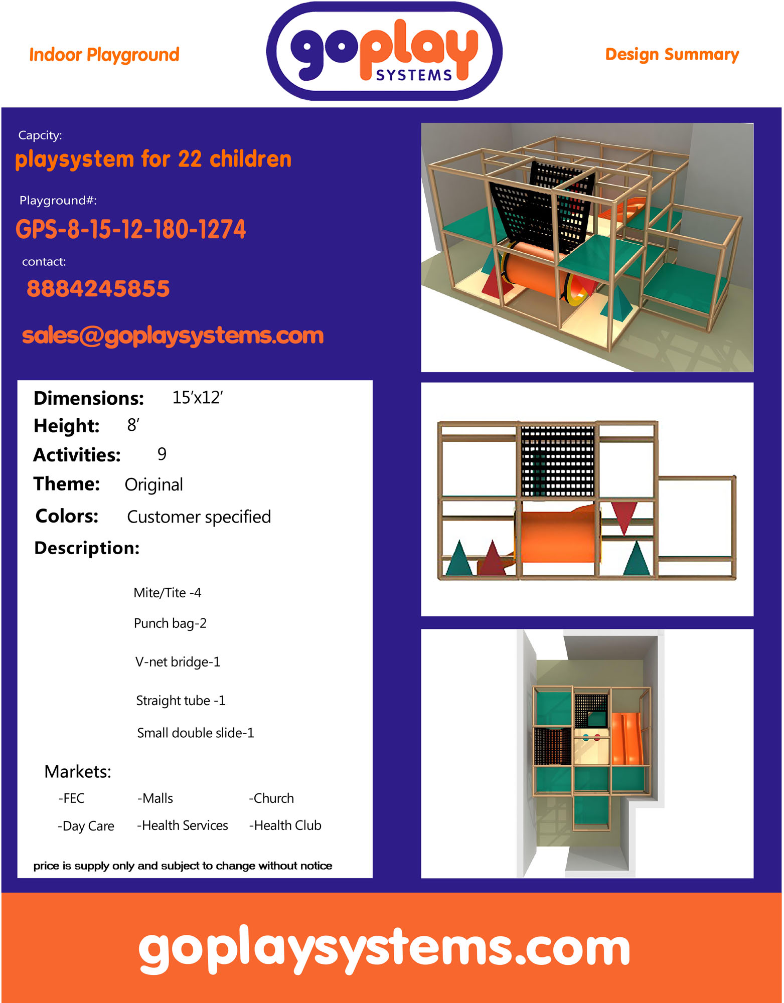 El parque infantil interior GPS1274 es un sistema de juego interior personalizado para niños de tres a doce años. La unidad de juego blando mide 4,5 m de ancho por 2,4 m de alto y 3,6 m de largo. El espacio mínimo requerido para este equipo de juego infantil es de aproximadamente 6,4 m de ancho, 3 m de techo y 5,5 m de largo. Superficie total: 16,5 m². Parque infantil interior de tamaño pequeño.
