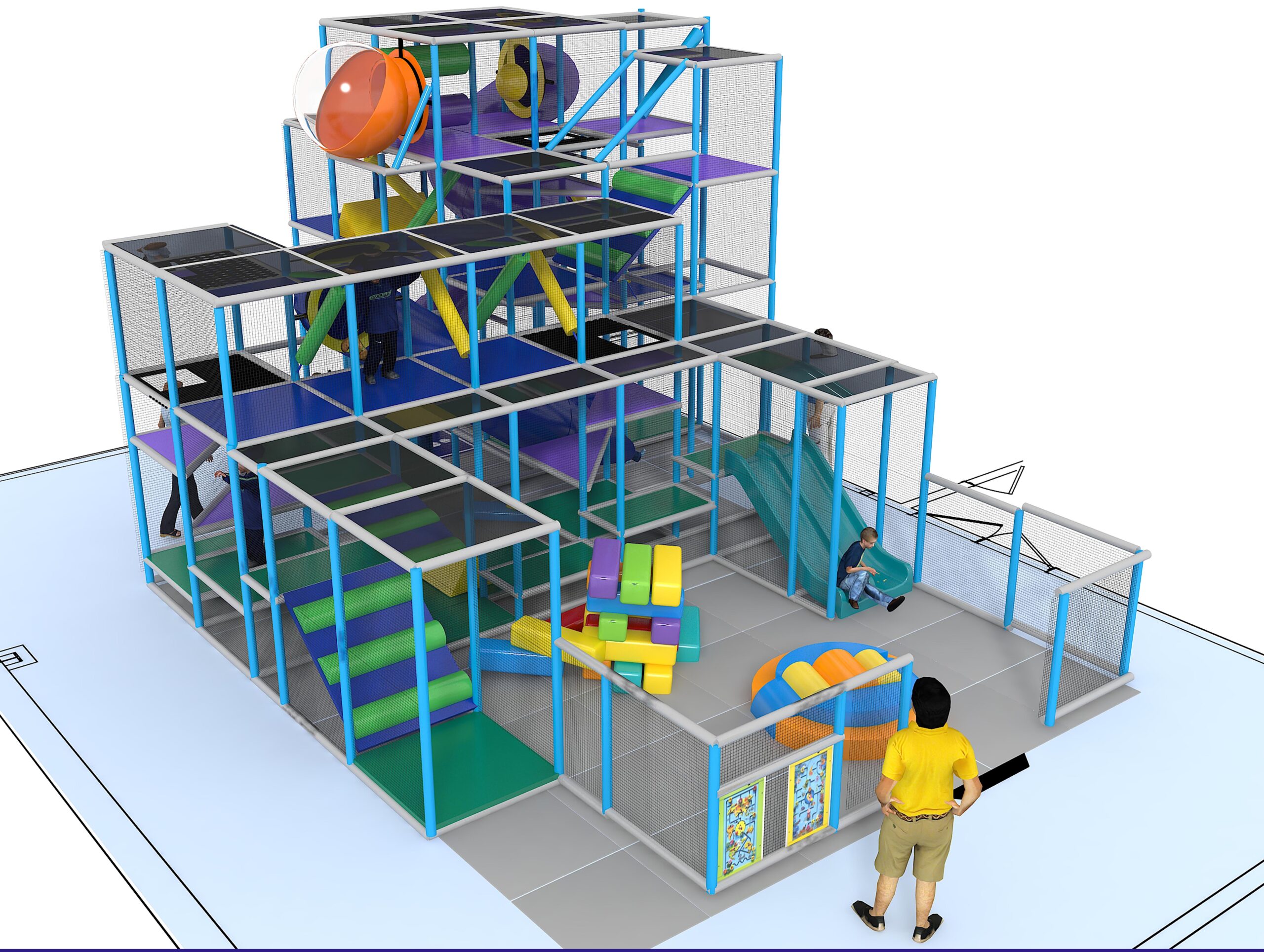 El parque infantil interior GPS1292 es un sistema de juego interior personalizado para niños de tres a doce años. La unidad de juego blando mide 11,8 m de ancho por 4,8 m de alto y 7,3 m de largo. El espacio mínimo requerido para este equipo de juego infantil es de aproximadamente 13,8 m de ancho, 5,5 m de techo y 9,1 m de largo. Superficie total: 80 m². Parque infantil interior de tamaño mediano.