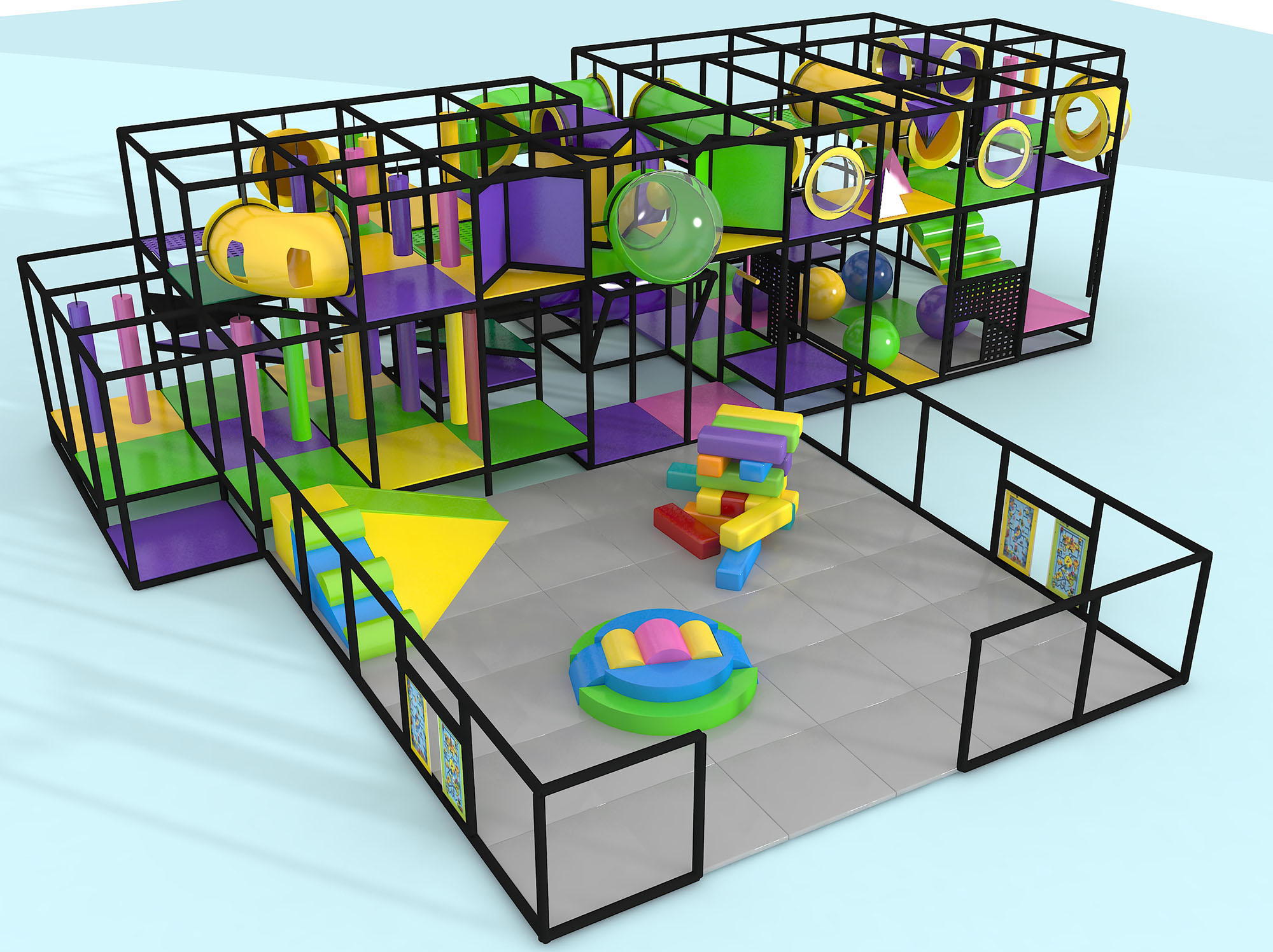 El parque infantil interior GPS1307 es un sistema de juego interior personalizado para niños de tres a doce años. La unidad de juego blando mide 13,4 m de ancho por 3,3 m de alto y 4,8 m de largo. El espacio mínimo requerido para este equipo de juego infantil es de aproximadamente 15,2 m de ancho, con un techo de 4,9 m y 6,7 m de largo. Superficie total: 65,4 m². Parque infantil interior de tamaño mediano.