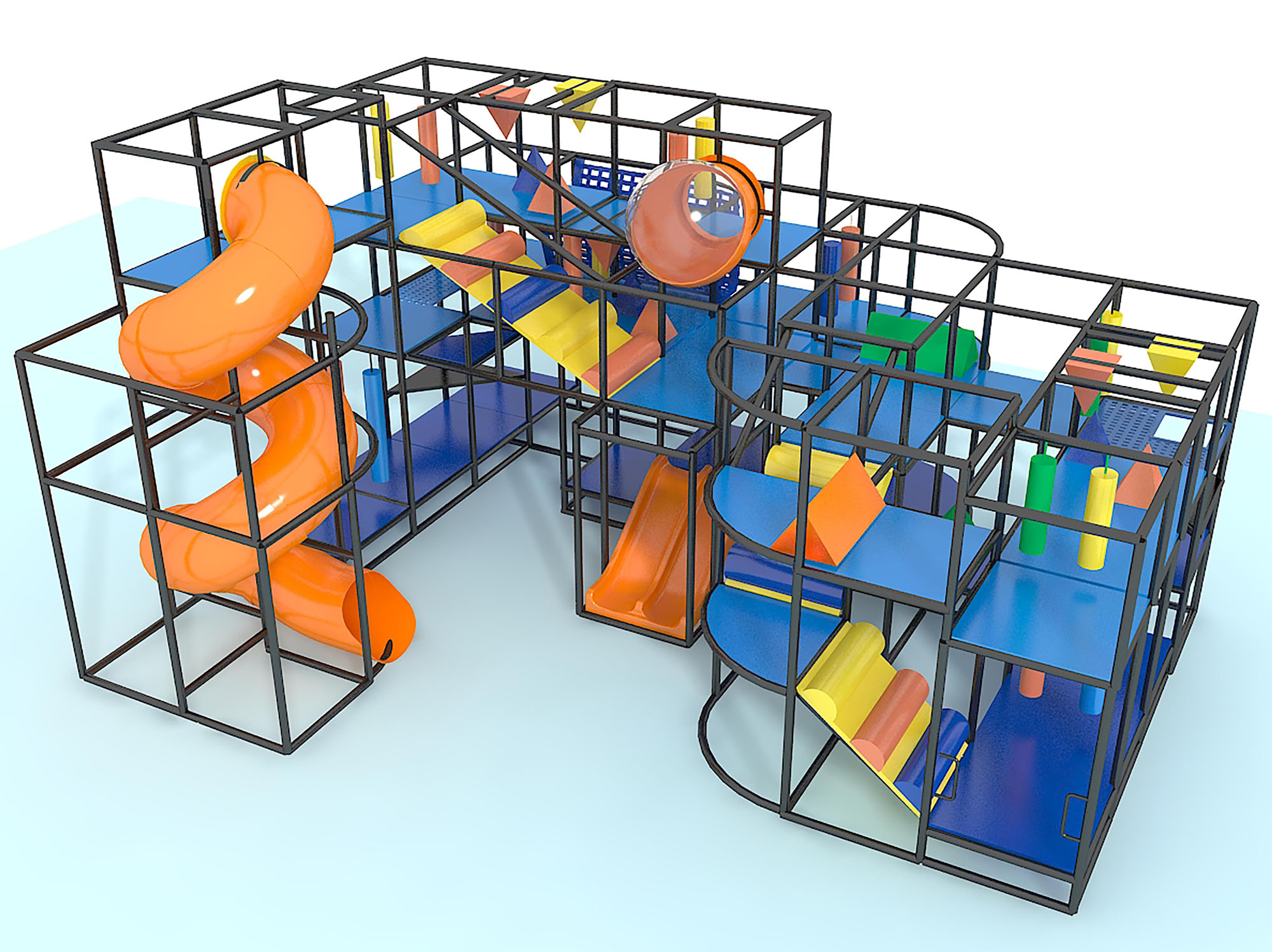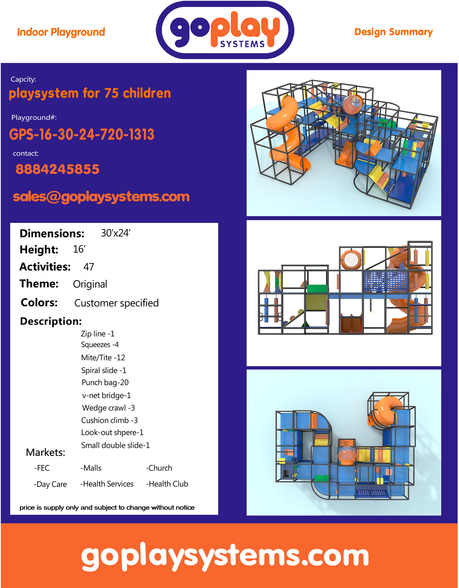 El parque infantil interior GPS1313 es un sistema de juego interior personalizado para niños de tres a doce años. La unidad de juego blando mide 9,1 m de ancho por 4,8 m de alto y 7,3 m de largo. El espacio mínimo requerido para este equipo de juego infantil es de aproximadamente 11,8 m de ancho, con un techo de 5,5 m y 9,1 m de largo. Superficie total: 65 m². Parque infantil interior de tamaño mediano.