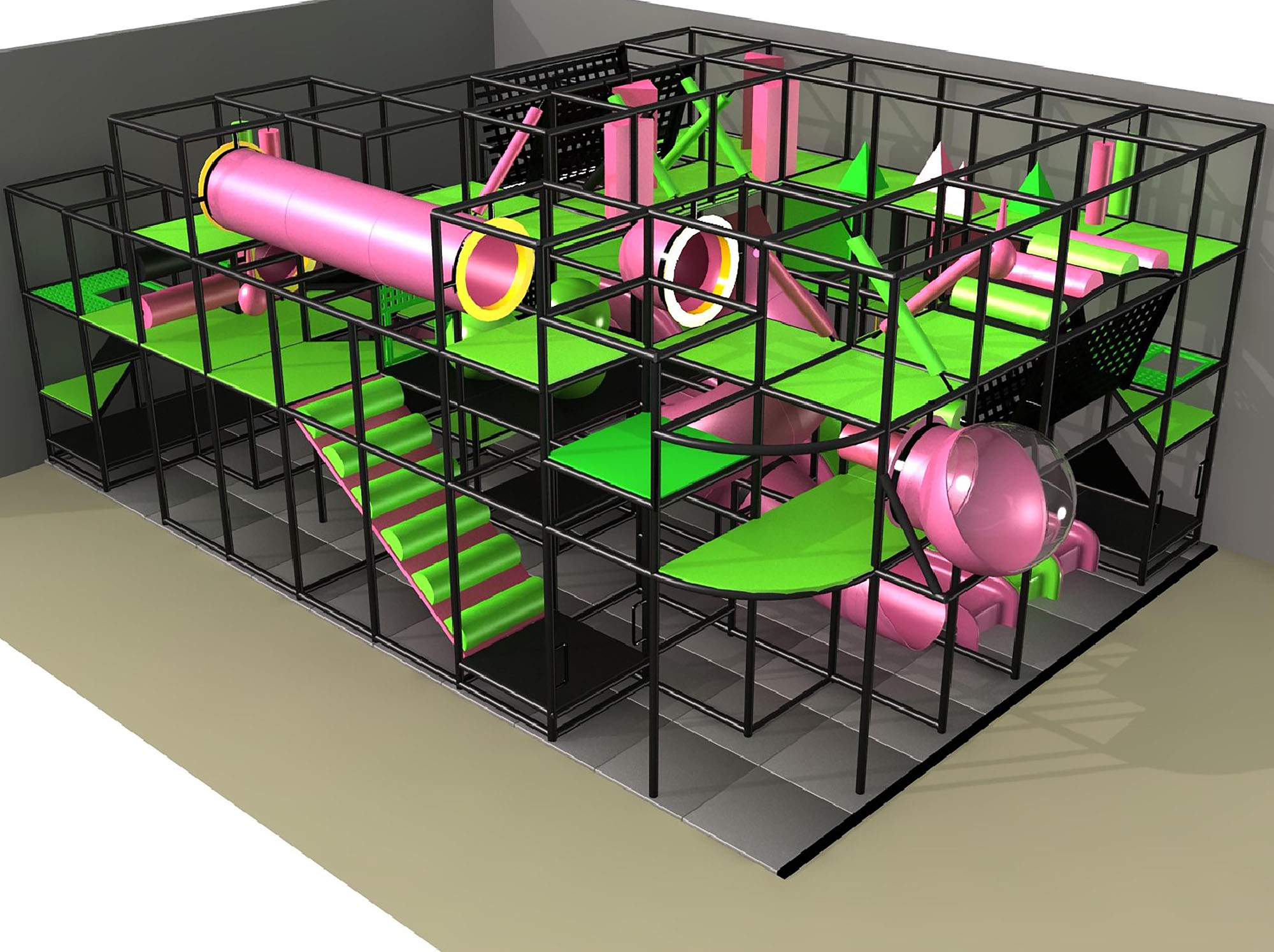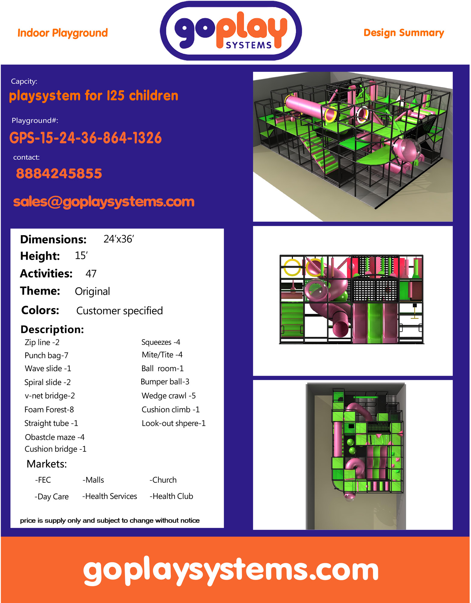 El parque infantil interior GPS1326 es un sistema de juego interior personalizado para niños de tres a doce años. La unidad de juego blando mide 7,3 m de ancho por 4,5 m de alto y 11,9 m de largo. El espacio mínimo requerido para este equipo de juego infantil es de aproximadamente 9,1 m de ancho, 5,2 m de techo y 13,8 m de largo. Superficie total: 80 m². Parque infantil interior de tamaño mediano-grande.