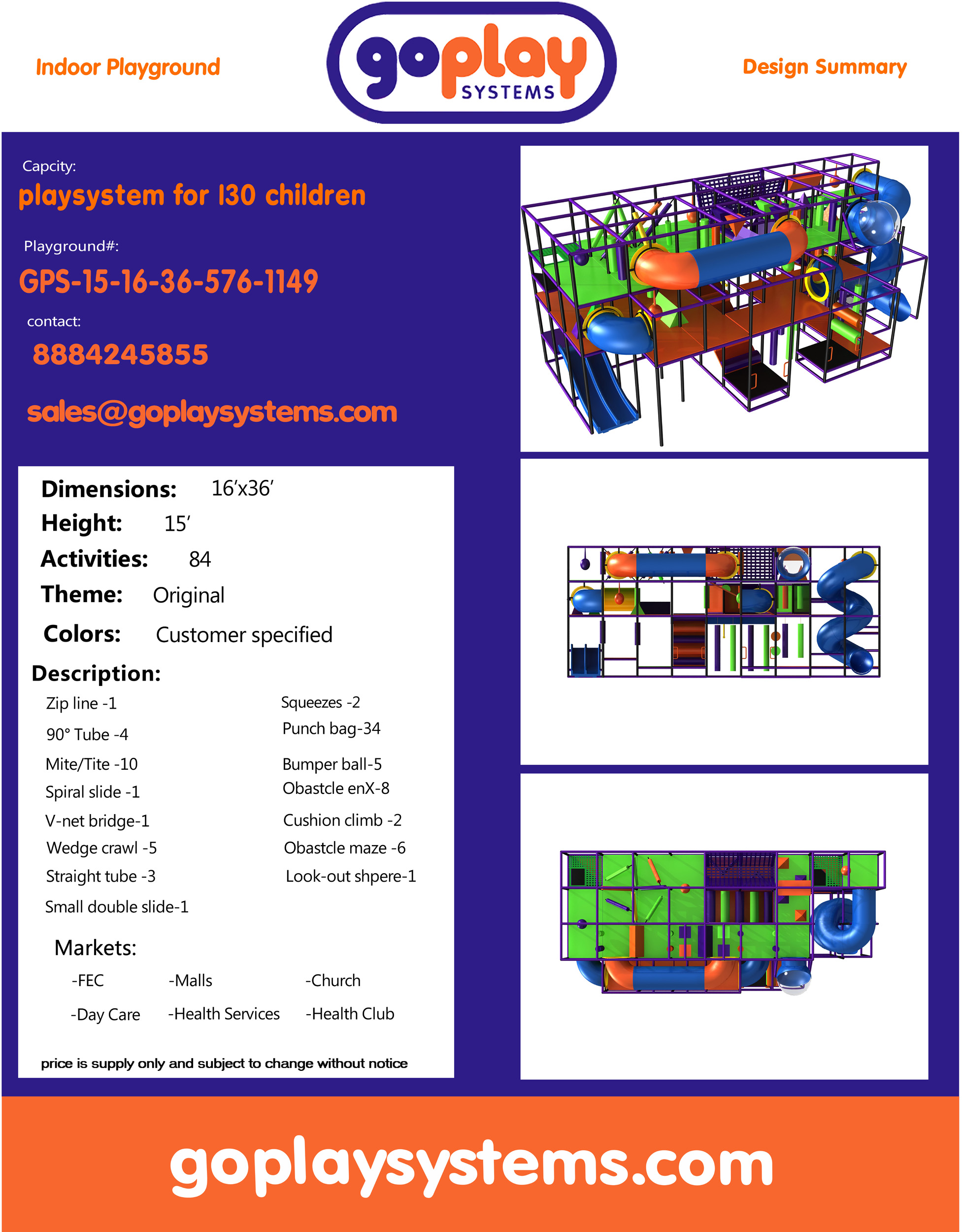 Parque infantil interior GPS1149 – 15 pies de alto x 16 pies de ancho x 36 pies.