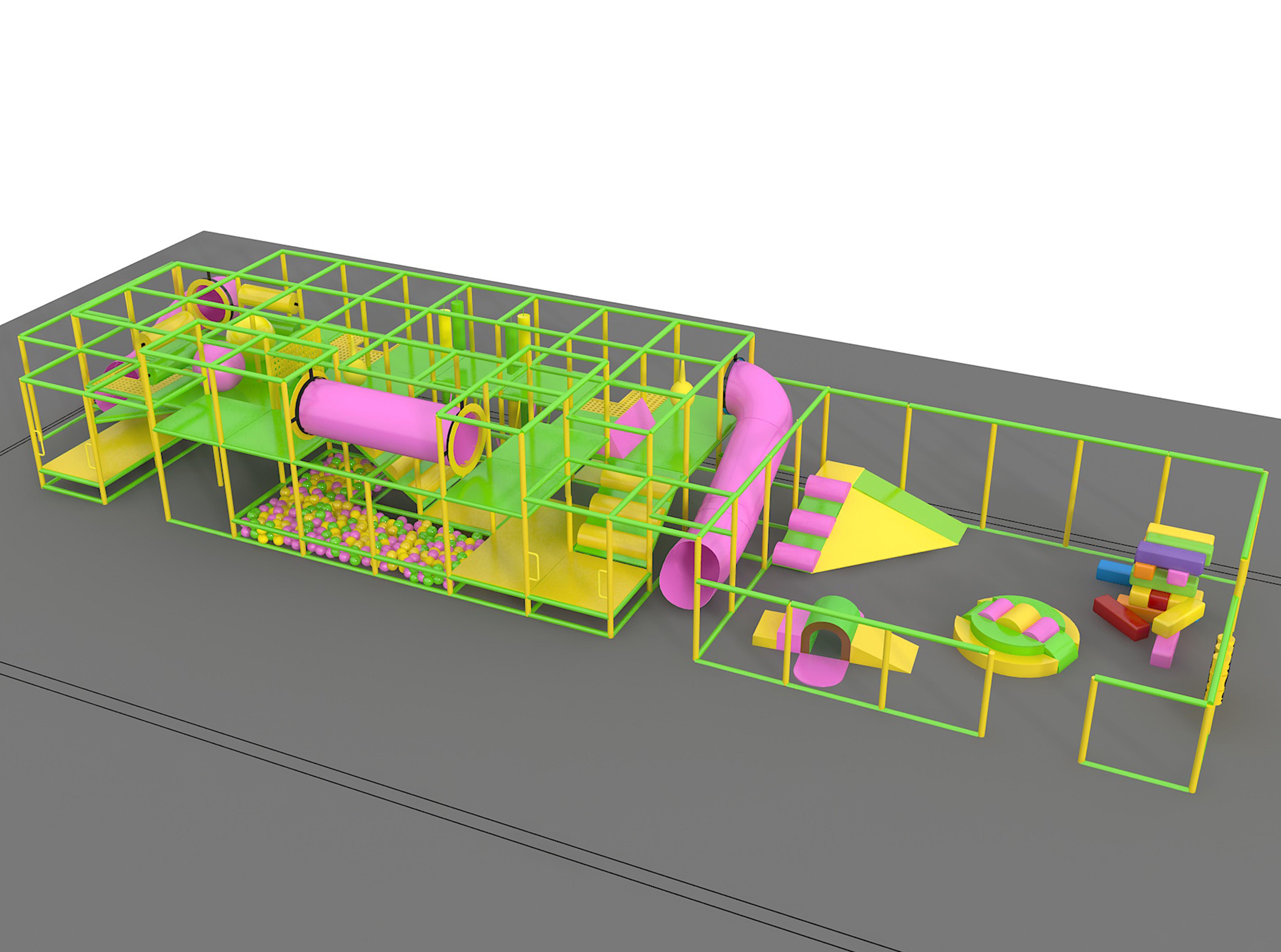 El parque infantil interior GPS175 es un sistema de juego blando modular diseñado a medida para niños de forma segura. El sistema mide 18,2 m de ancho por 2,7 m de alto y 4,8 m de largo. El espacio interior mínimo requerido para este parque infantil es de aproximadamente 20,3 m de ancho, con un techo de 3,3 m y 6,7 m de largo. Parque infantil interior de tamaño mediano.