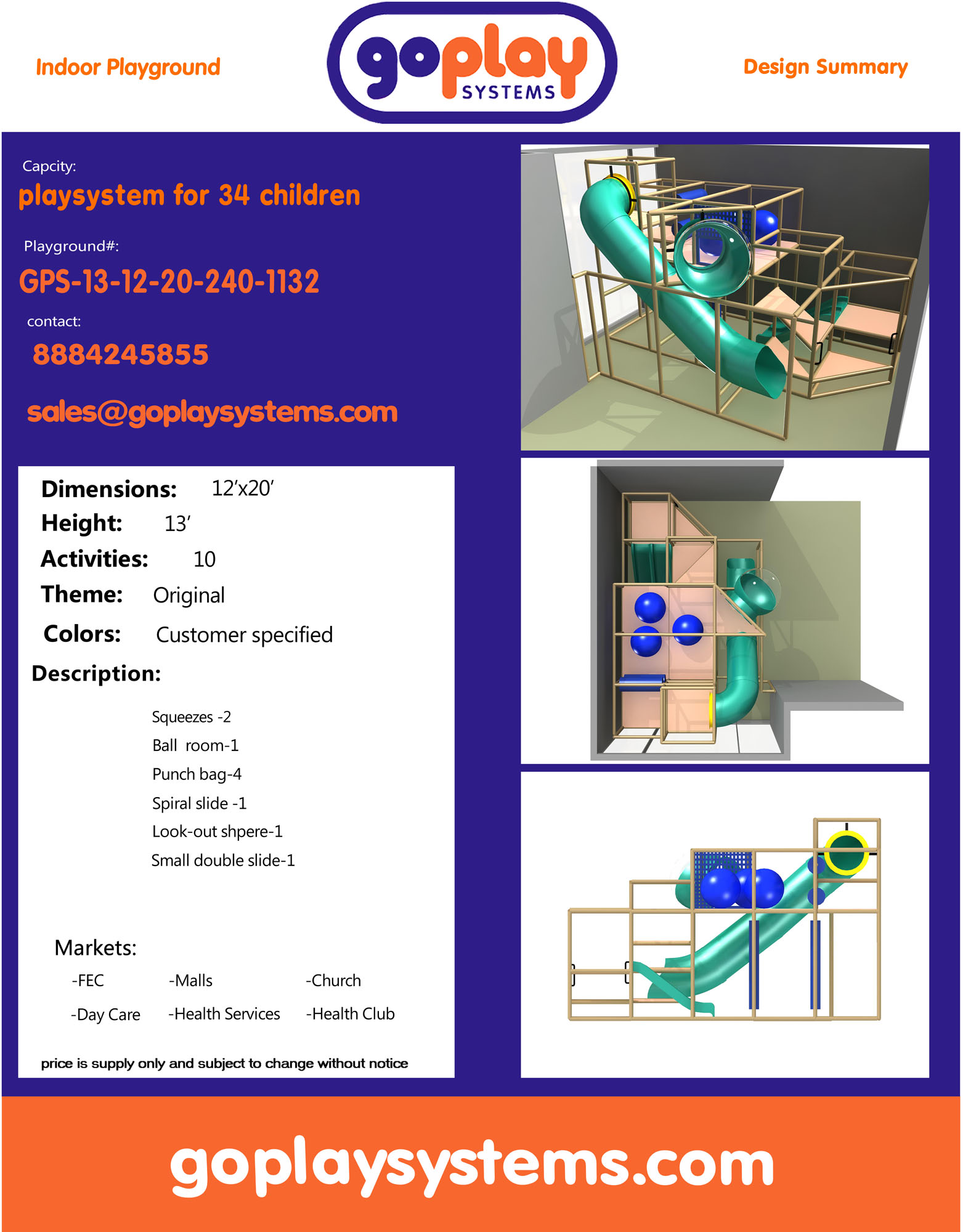 El parque infantil interior GPS240 es un sistema de juego blando modular diseñado a medida para niños de forma segura. El sistema mide 3,6 m de ancho por 4,9 m de alto y 6,1 m de largo. El espacio interior mínimo requerido para este parque infantil es de aproximadamente 5,5 m de ancho, 4,5 m de techo y 8,9 m de largo. Parque infantil interior de tamaño mediano.