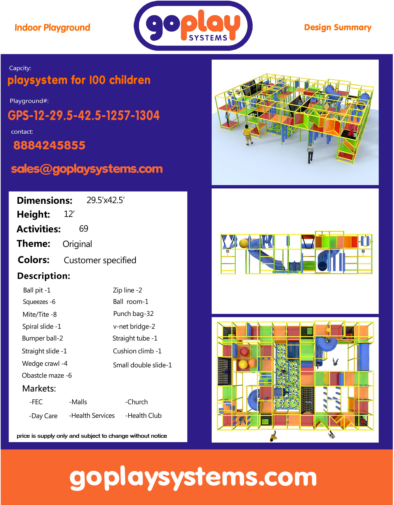 Parque infantil interior GPS5: 12 pies de alto x 29,5 pies de ancho x 42,5 pies.