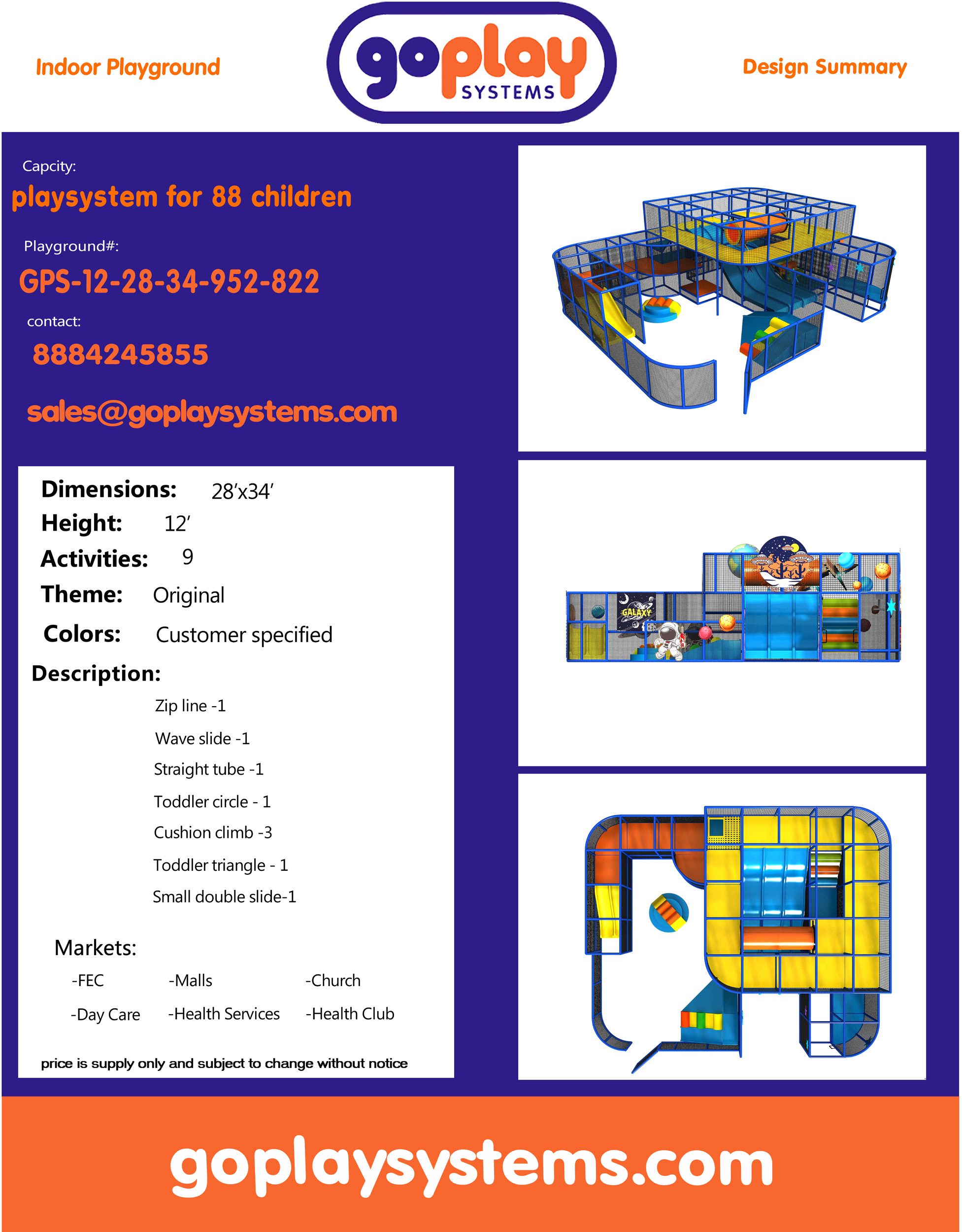 El parque infantil interior GPS822 es un sistema de juego blando modular, diseñado a medida y desarrollado para niños de forma segura. El sistema mide 8,5 m de ancho por 3,6 m de alto y 10,3 m de largo. El espacio interior mínimo requerido para este parque infantil es de aproximadamente 10,3 m de ancho, con un techo de 4,2 m y 12,1 m de largo. Parque infantil interior de tamaño mediano.
