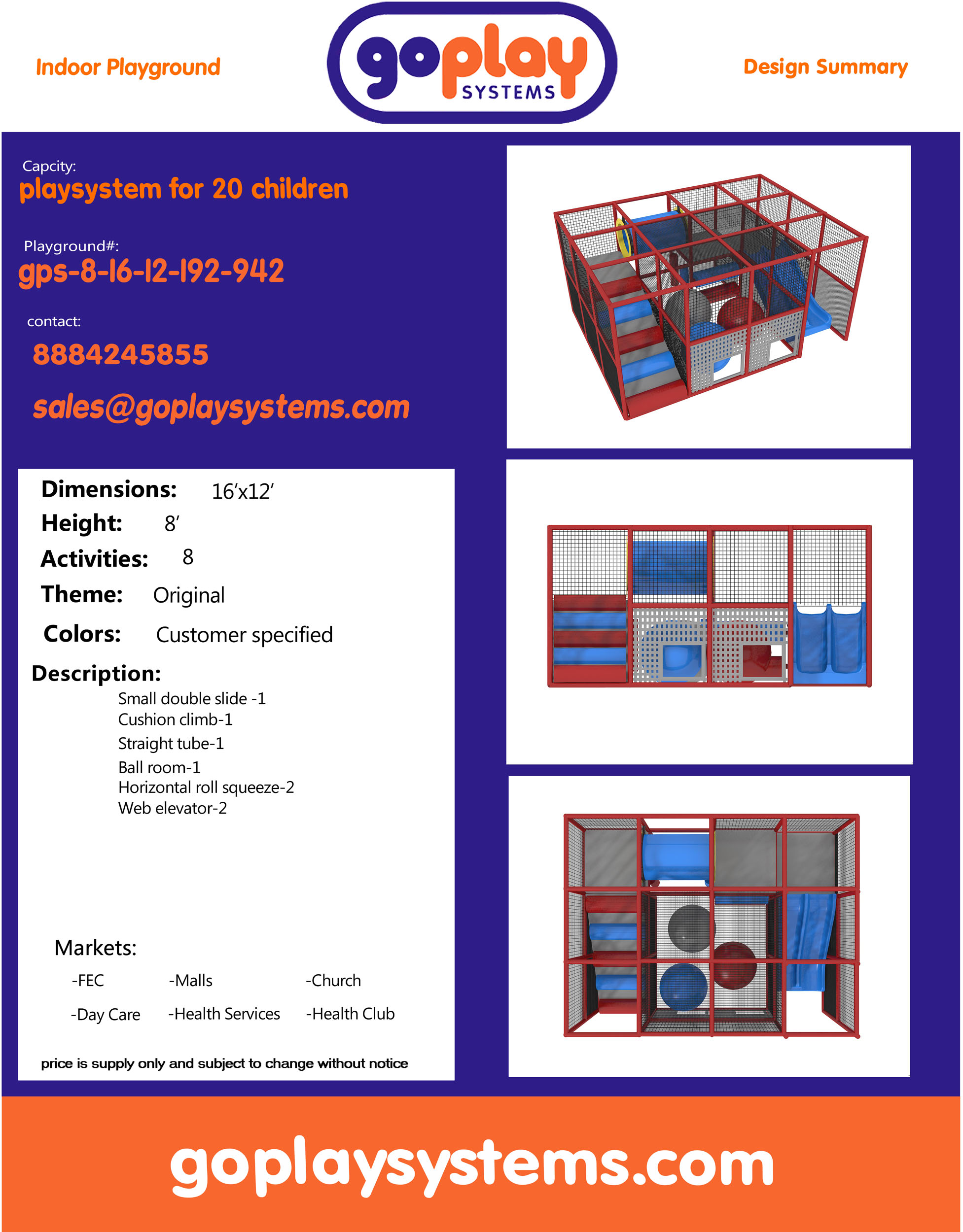 El parque infantil interior GPS942 es un sistema modular de juego blando, diseñado a medida, desarrollado para niños de 3 a 12 años de forma segura. El sistema mide 2,4 m de alto x 4,8 m de ancho x 3,6 m.
