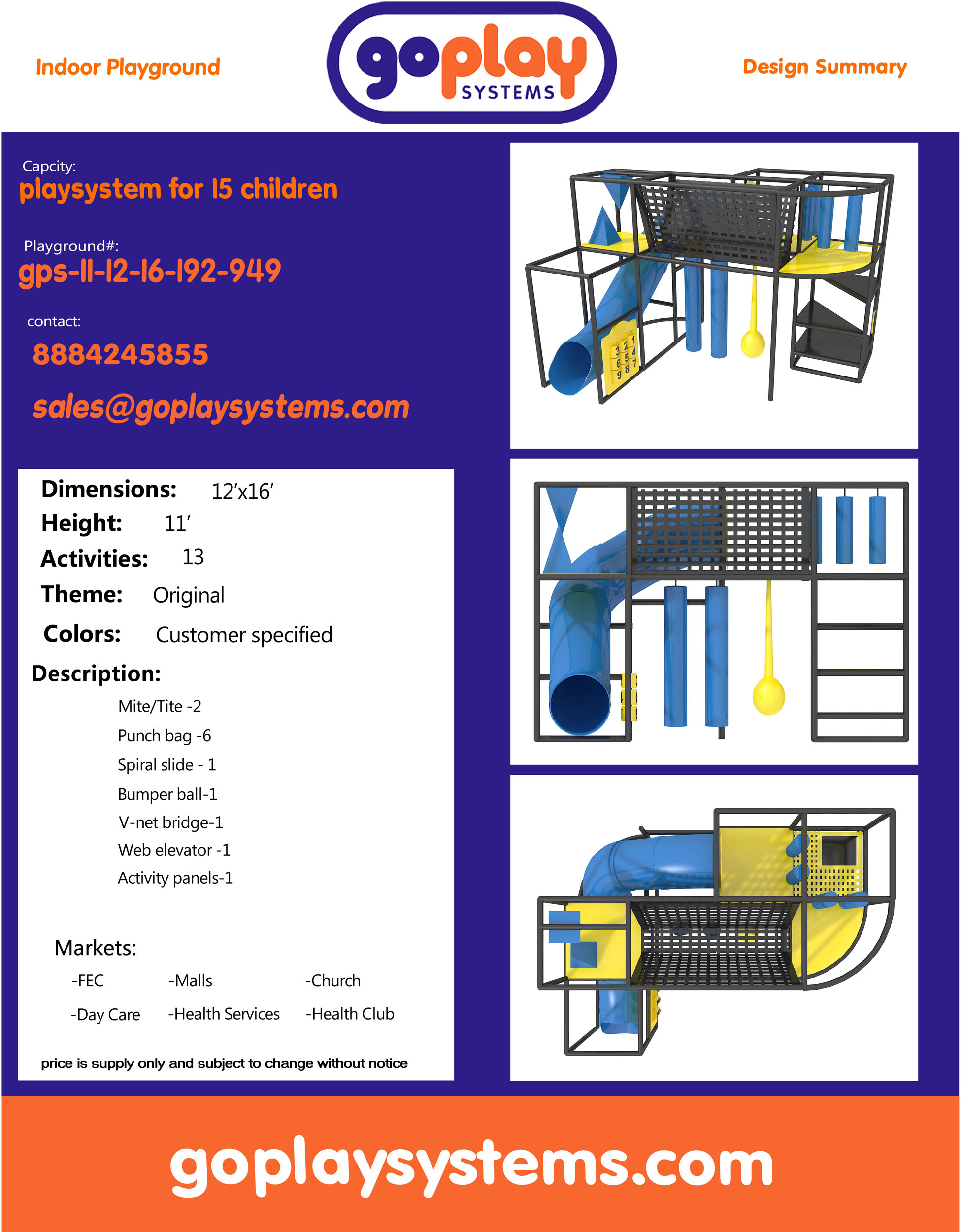 El parque infantil interior GPS949 es un sistema modular de juego blando, diseñado a medida y desarrollado para niños de 3 a 12 años de forma segura. El sistema mide 3,35 m de alto x 3,66 m de ancho x 4,88 m de alto.