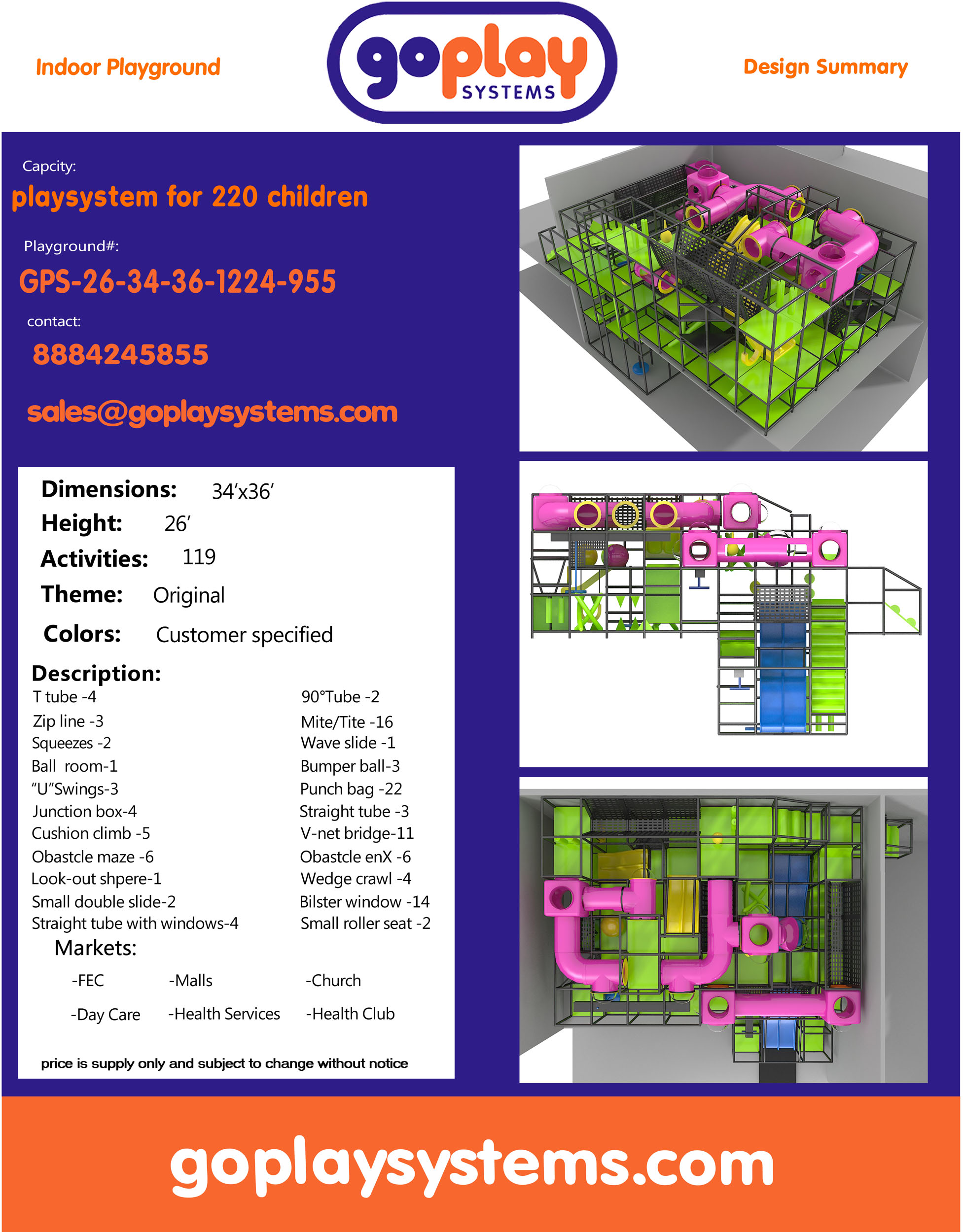 El parque infantil interior GPS955 es un sistema modular de juego blando, diseñado a medida y desarrollado para niños de 3 a 12 años de forma segura. El sistema mide 7,9 m de alto x 10,3 m de ancho x 11,8 m.