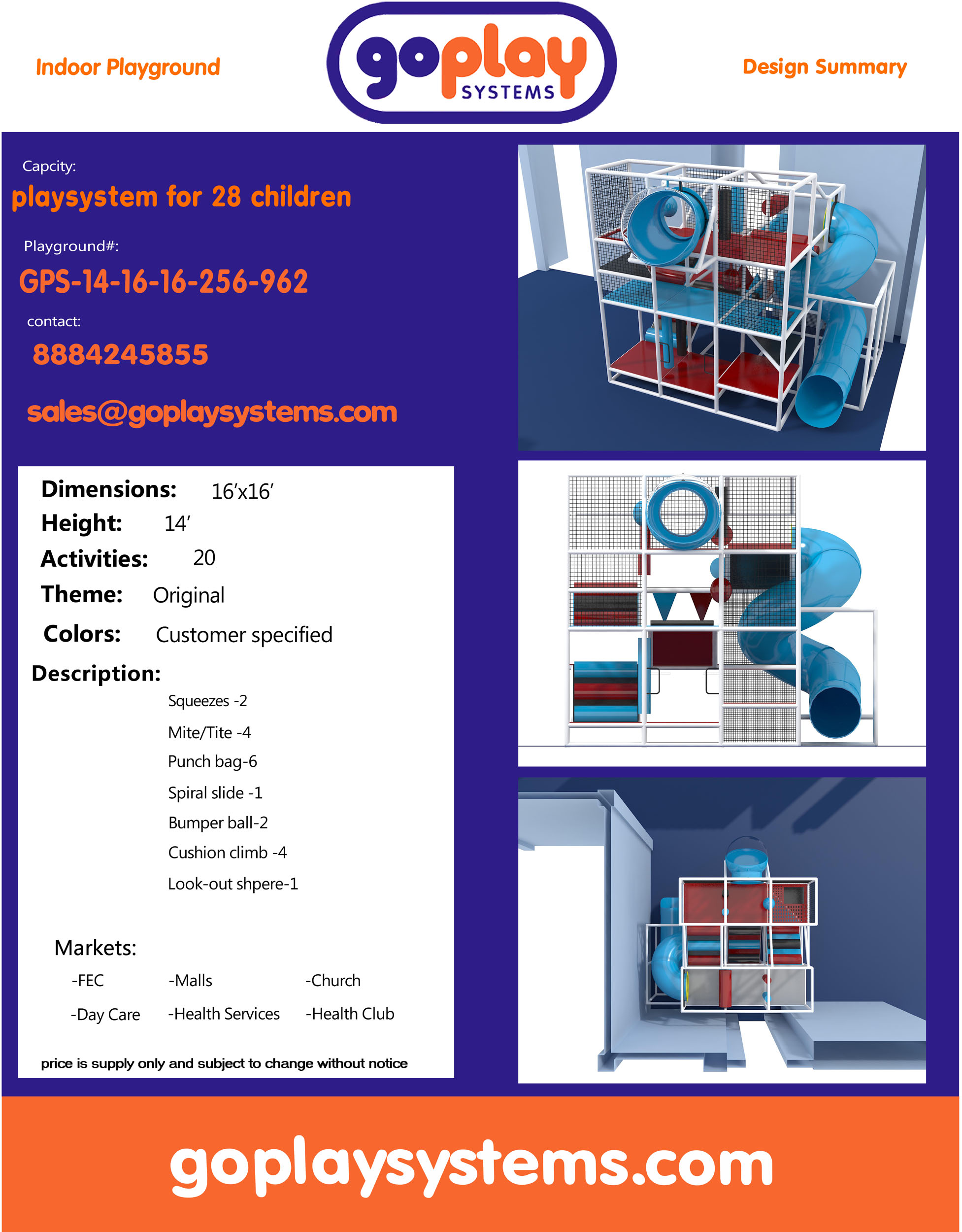 Parque infantil interior GPS962 – (Tamaño del sistema de juego interior) – 14 pies de alto x 16 pies de ancho x 16 pies.