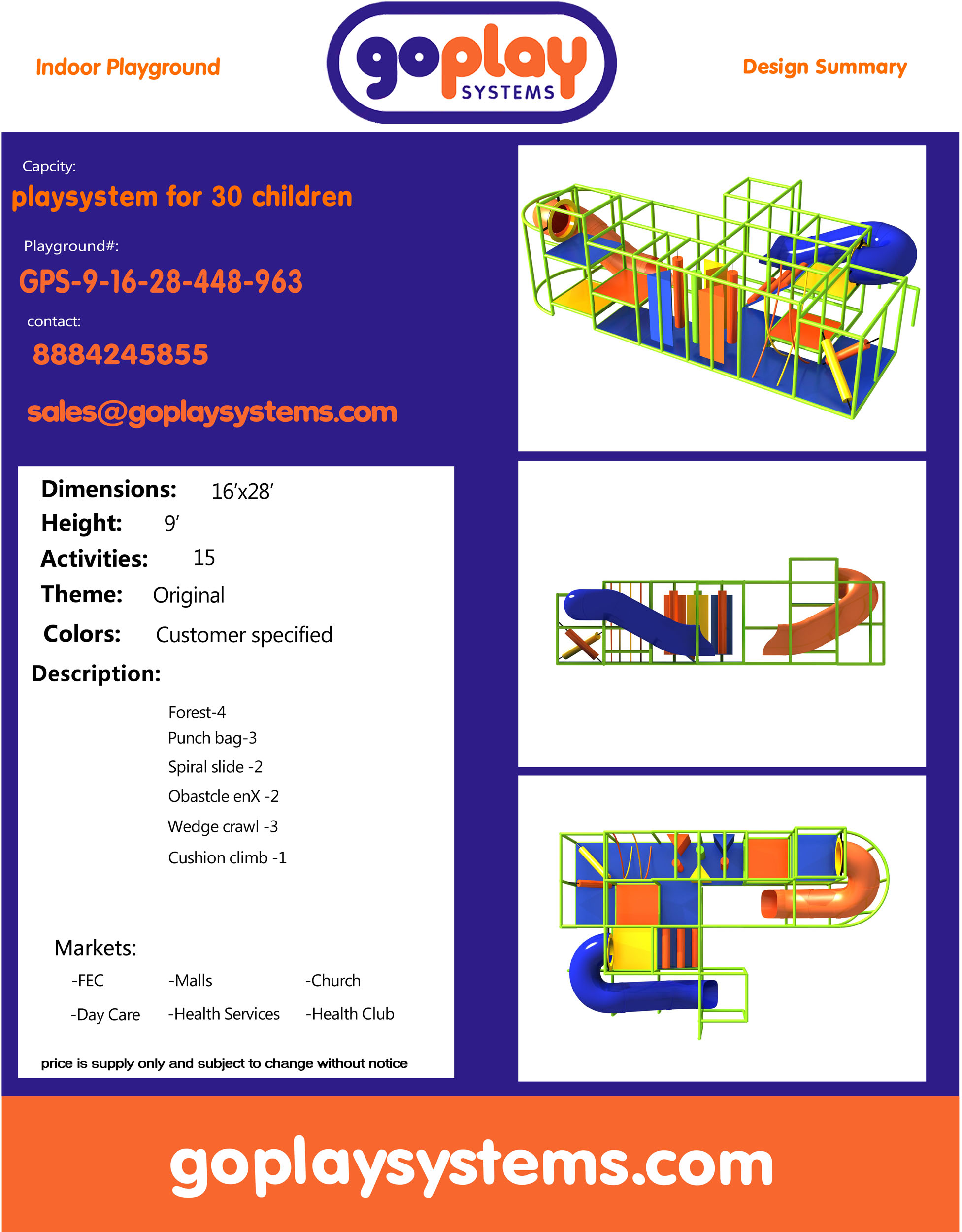 El parque infantil interior GPS963 es un sistema modular de juego blando, diseñado a medida y desarrollado para niños de 3 a 12 años de forma segura. El sistema mide 2,7 m de alto x 4,8 m de ancho x 8,5 m.