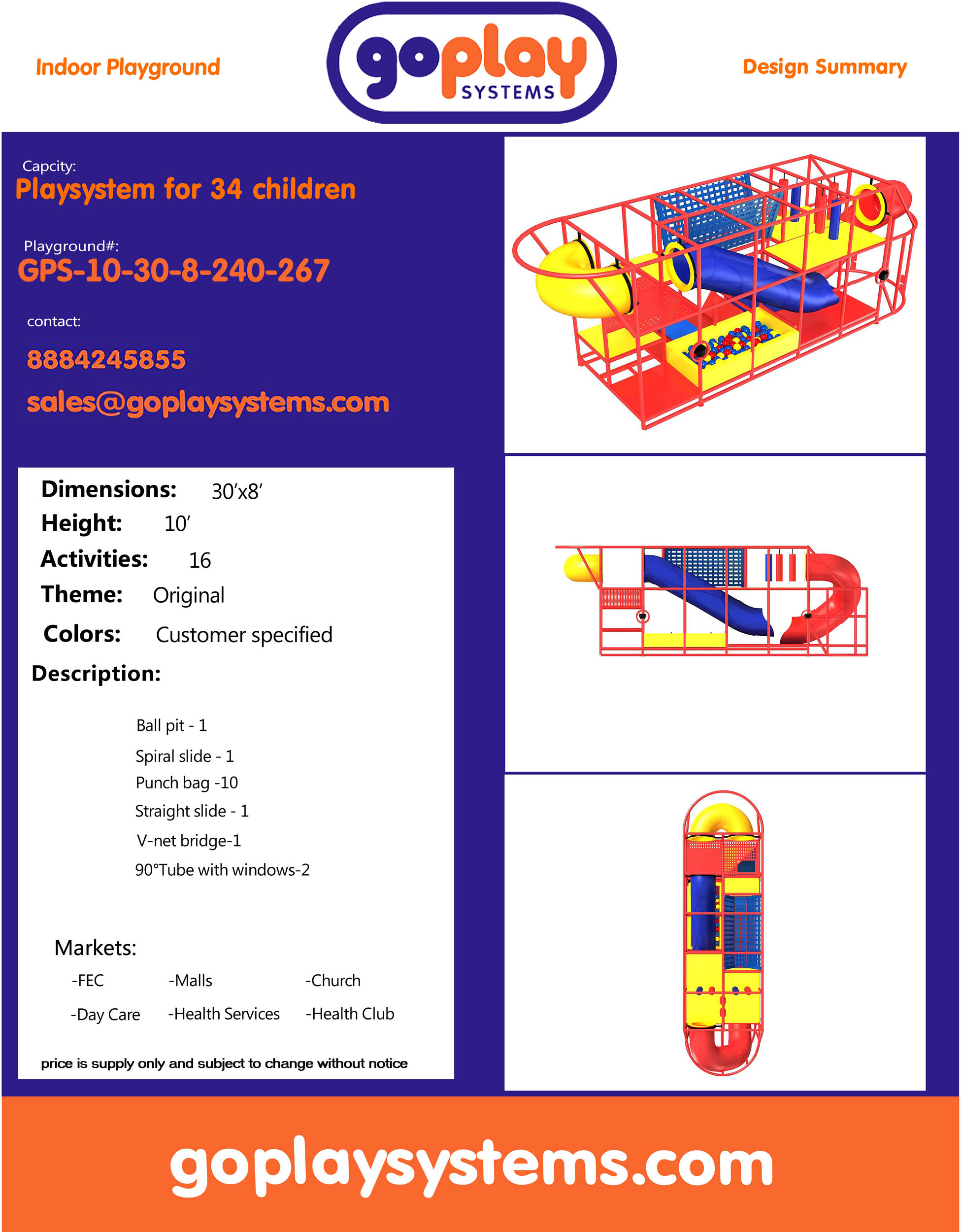 O parque infantil coberto GPS267 é um sistema de recreação coberto personalizado para crianças de três a doze anos. A unidade de recreação com piso macio mede 9,1 m de largura por 3,0 m de altura e 2,4 m de comprimento. O espaço mínimo necessário para este equipamento de recreação infantil é de aproximadamente 11,8 m de largura, com pé-direito de 3,6 m e 4,2 m de comprimento. Parque infantil coberto de tamanho médio.