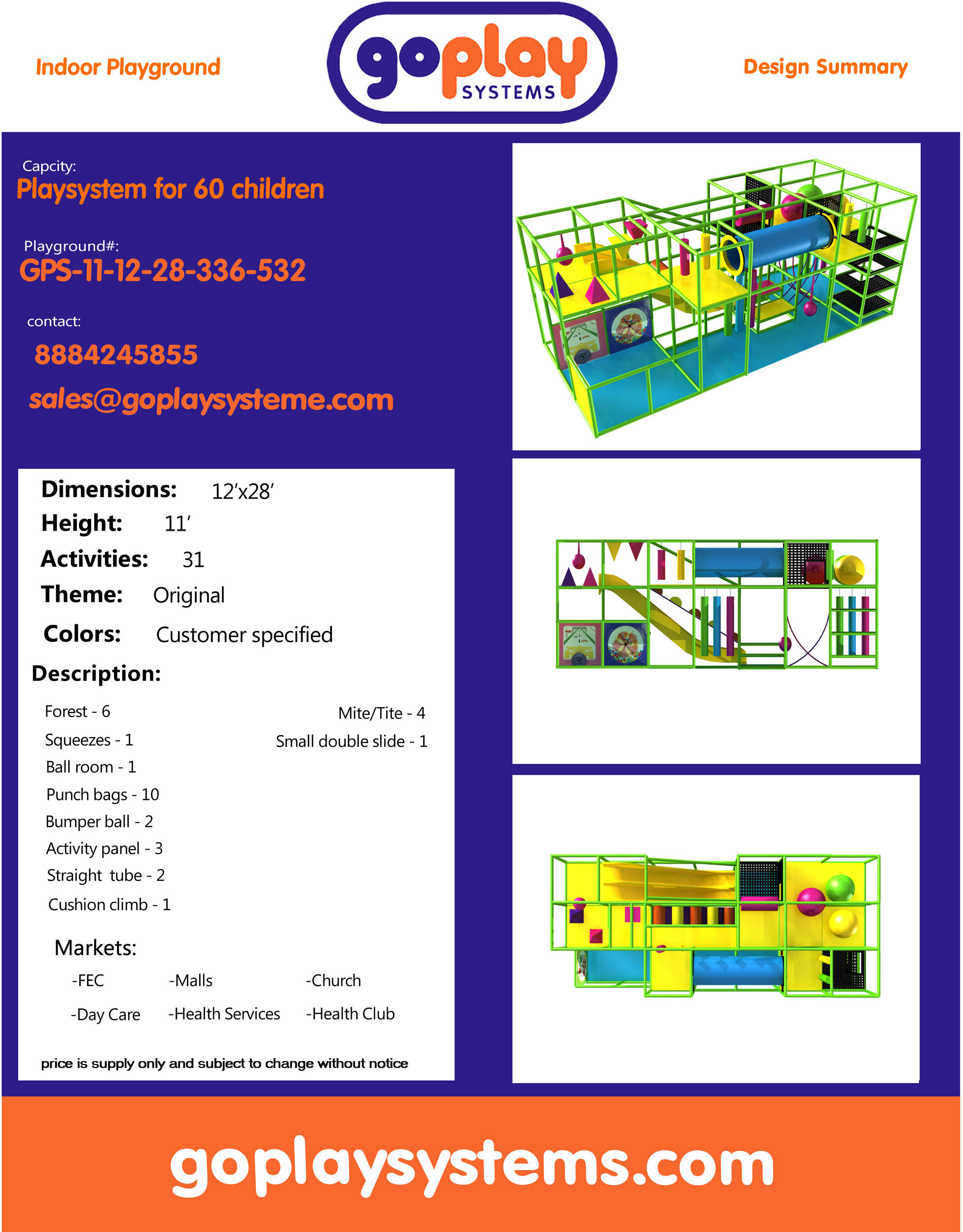 O parque infantil coberto GPS532 é um sistema de recreação coberto personalizado para crianças de três a doze anos. A unidade de recreação com piso macio mede 3,6 m de largura por 3,3 m de altura e 8,5 m de comprimento. O espaço mínimo necessário para este equipamento de recreação infantil é de aproximadamente 5,5 m de largura, 4,9 m de altura e 10,3 m de comprimento. Parque infantil coberto de tamanho médio.