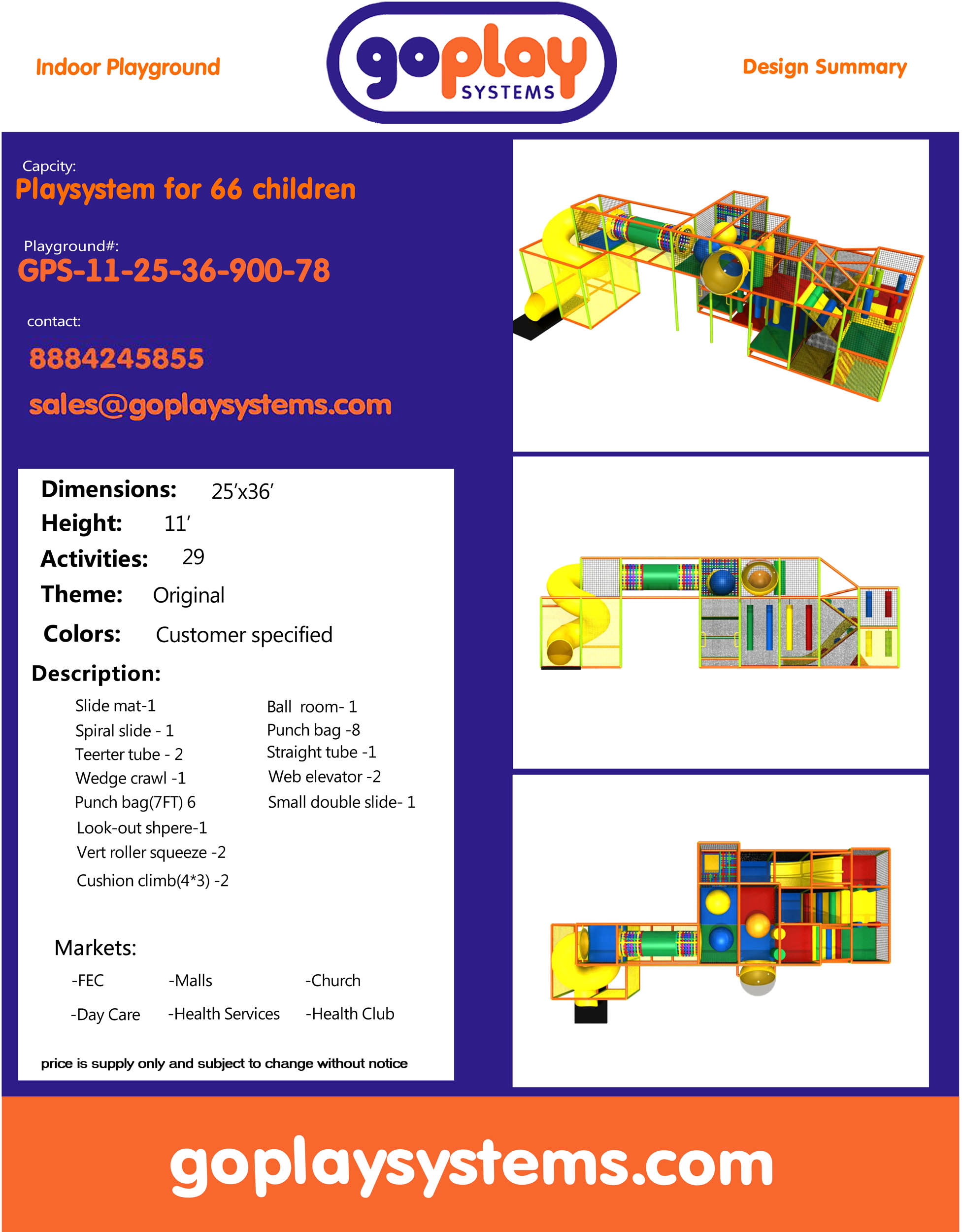 O parque infantil coberto GPS78 é um sistema de recreação coberto personalizado para crianças de três a doze anos. A unidade de recreação com piso macio mede 4,8 m de largura por 3,3 m de altura e 10,3 m de comprimento. O espaço mínimo necessário para este equipamento de recreação infantil é de aproximadamente 6,7 m de largura, 4,9 m de altura e 12,1 m de comprimento. Parque infantil coberto de tamanho médio.