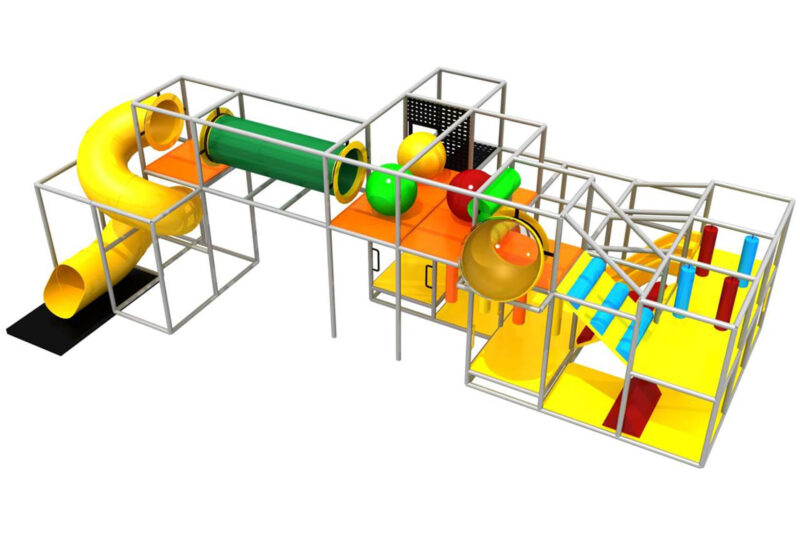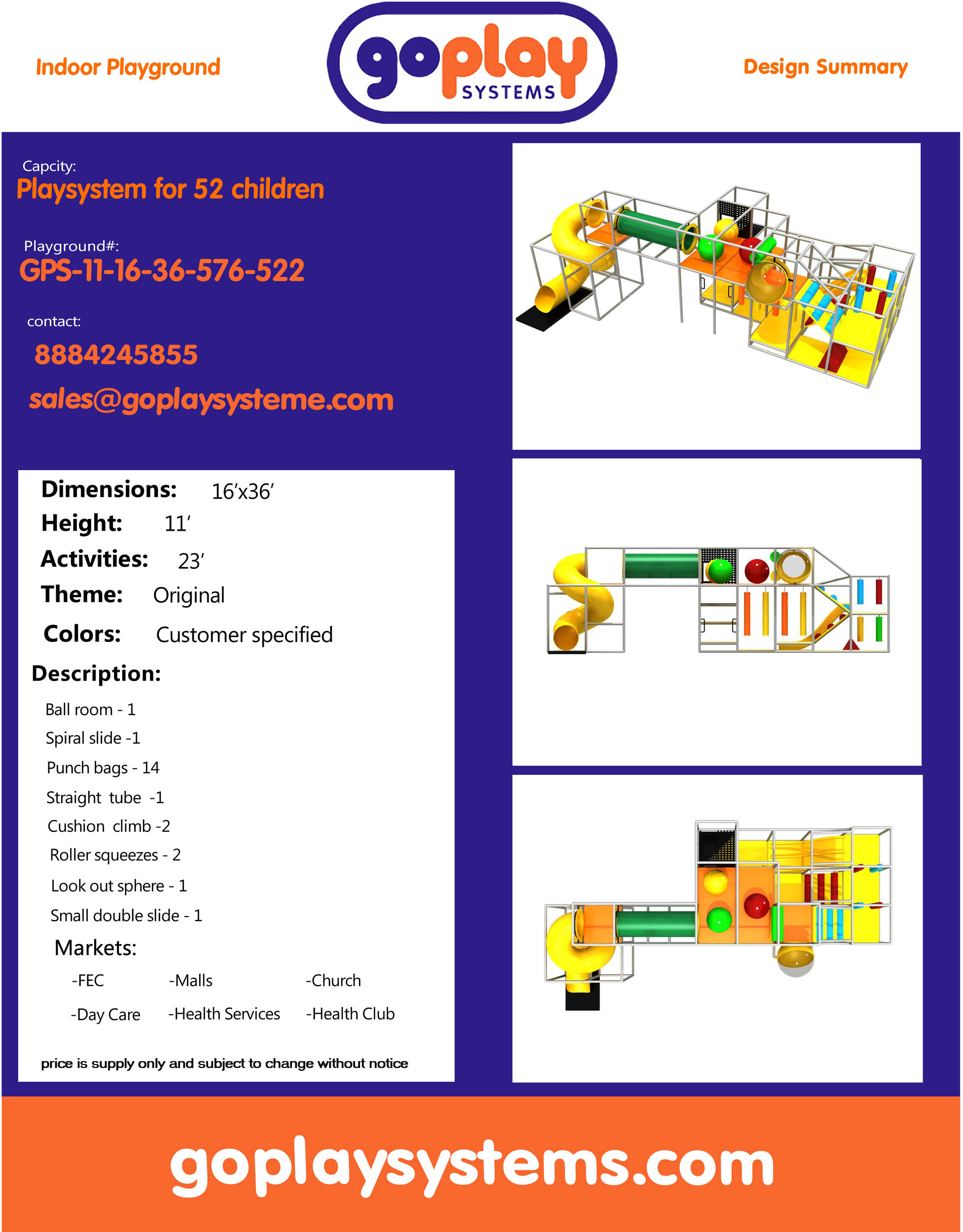 O parque infantil coberto GPS522 é um sistema de recreação coberto personalizado para crianças de três a doze anos. A unidade de recreação com piso macio mede 4,8 m de largura por 3,3 m de altura e 11,8 m de comprimento. O espaço mínimo necessário para este equipamento de recreação infantil é de aproximadamente 6,7 m de largura, 4,9 m de altura e 13,8 m de comprimento. Parque infantil coberto de tamanho médio.