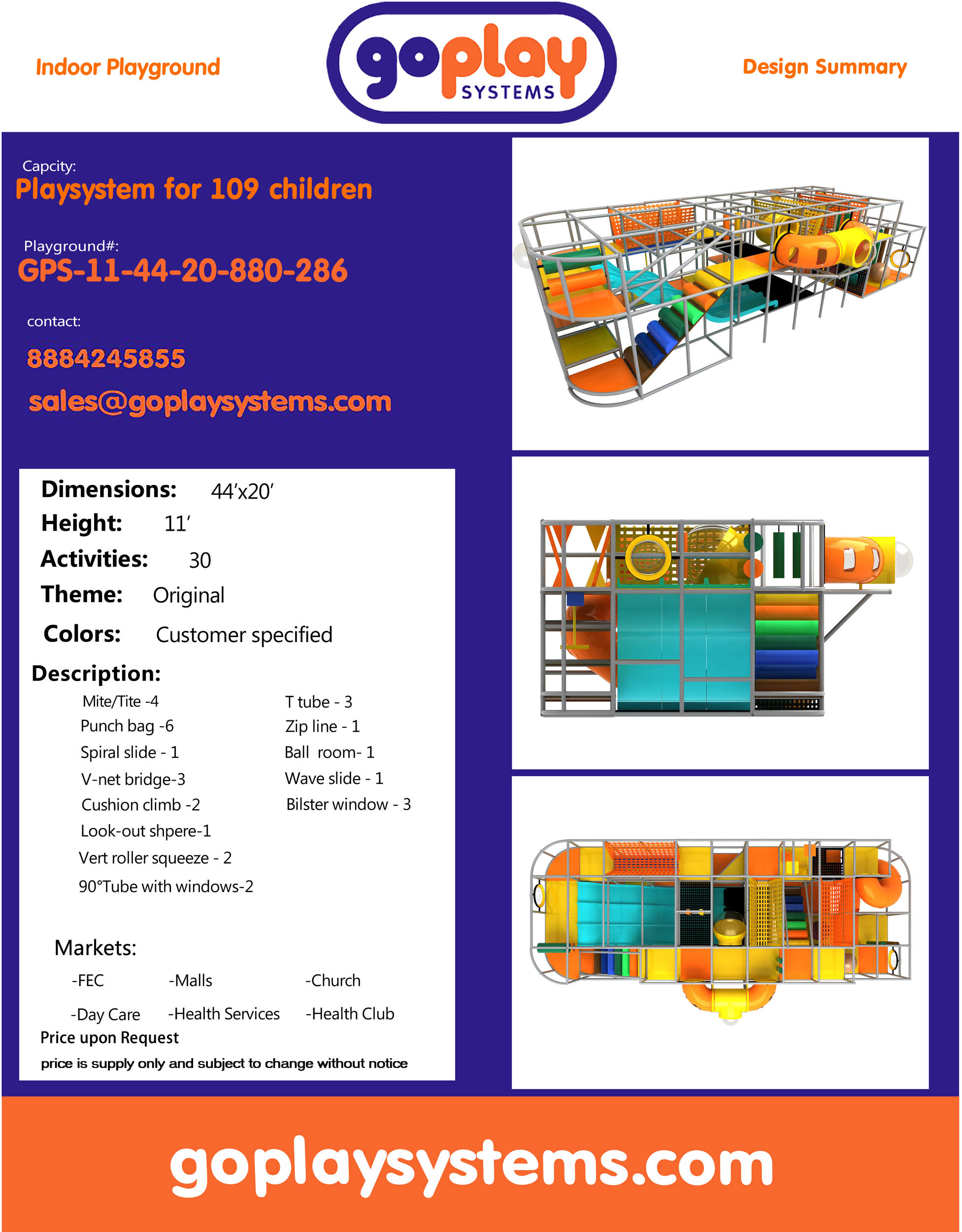 O parque infantil coberto GPS286 é um sistema de recreação coberto personalizado para crianças de três a doze anos. A unidade de recreação com piso macio mede 6,1 m de largura por 3,3 m de altura e 13,4 m de comprimento. O espaço mínimo necessário para este equipamento de recreação infantil é de aproximadamente 8,9 m de largura, 4,9 m de altura e 15,2 m de comprimento. Parque infantil coberto de tamanho médio.