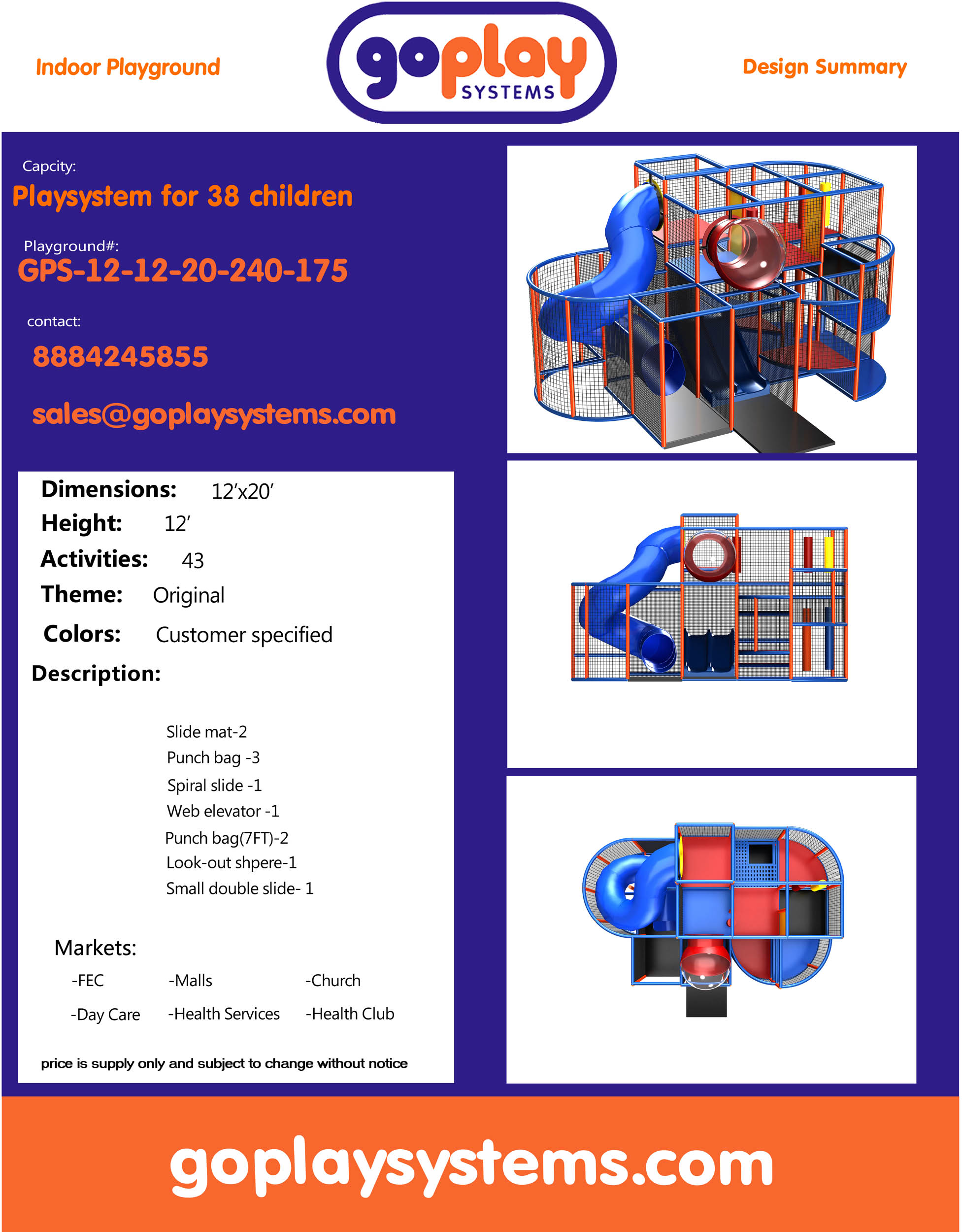 O parque infantil coberto GPS175 é um parque infantil modular com piso macio, projetado sob medida, para crianças de três a doze anos. O sistema de brincadeiras interno mede 3,6 m de largura por 3,6 m de altura e 6,1 m de comprimento. O espaço mínimo necessário para este parque infantil interno é de aproximadamente 5,5 m de largura, 4,2 m de altura e 8,9 m de comprimento. Parque infantil interno de tamanho médio.