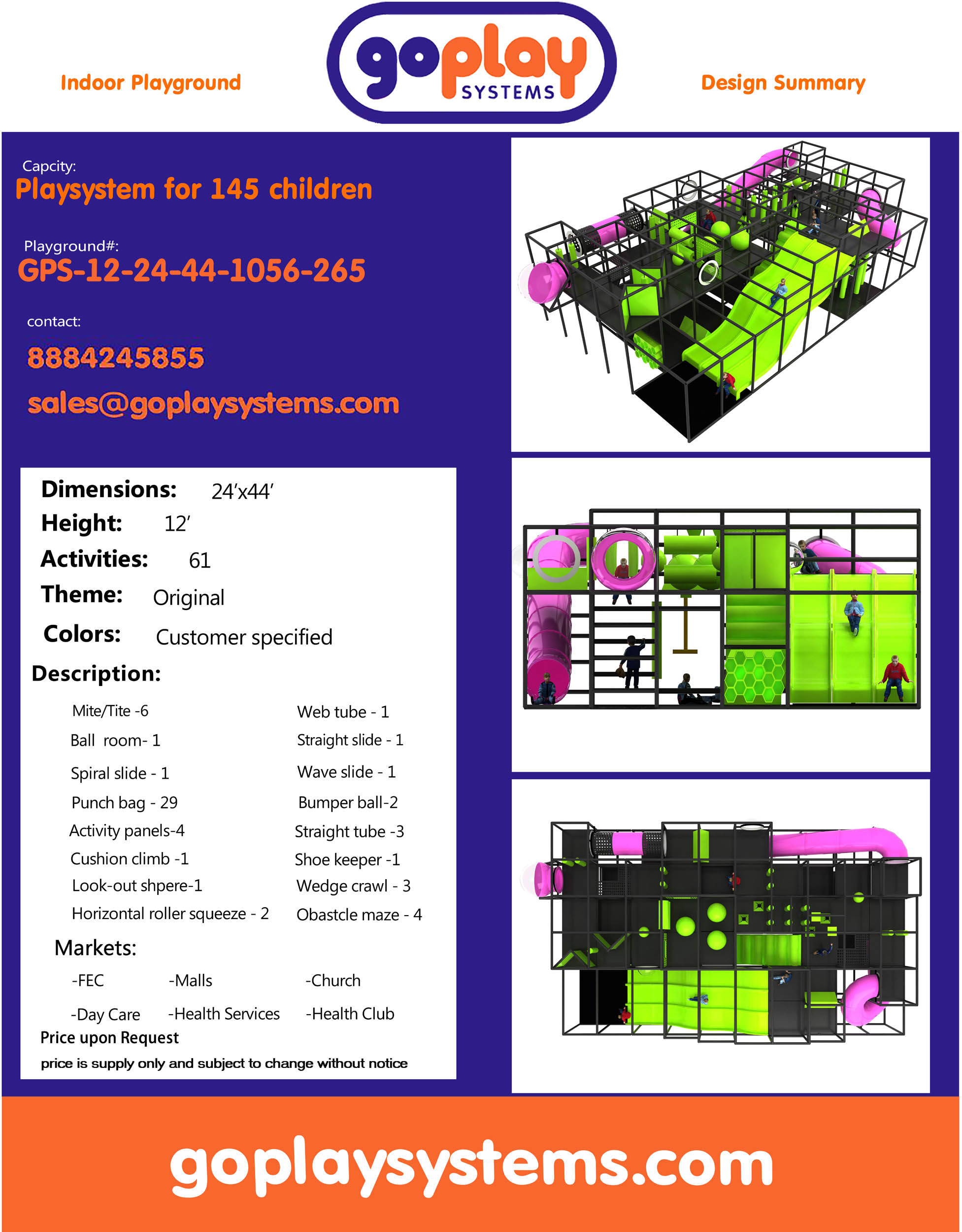 O parque infantil coberto GPS265 é um parque infantil modular com piso macio, projetado sob medida, para crianças de três a doze anos. O sistema de brincadeiras interno mede 7,3 m de largura por 3,6 m de altura e 13,4 m de comprimento. O espaço mínimo necessário para este parque infantil interno é de aproximadamente 9 m de largura, com pé-direito de 4,2 m e 15,2 m de comprimento. Parque infantil interno de tamanho médio.