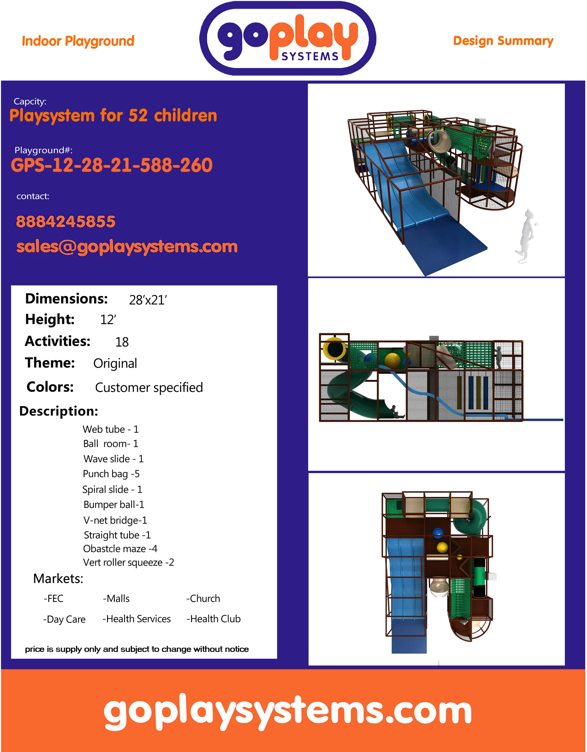 O parque infantil coberto GPS260 é um parque infantil modular com piso macio, projetado sob medida, para crianças de três a doze anos. O sistema de brincadeiras interno mede 8,5 m de largura por 3,6 m de altura e 6,4 m de comprimento. O espaço mínimo necessário para este parque infantil interno é de aproximadamente 10,3 m de largura, com pé-direito de 4,2 m e 8,2 m de comprimento. Parque infantil interno de tamanho médio.
