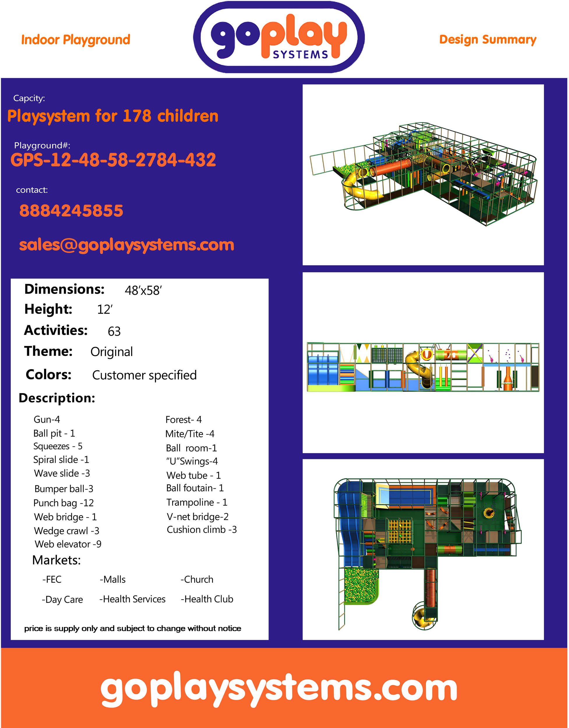 Compre o equipamento de recreação interna GPS432 – (dimensões do equipamento de recreação interna) 3,6 metros de altura x 14,6 metros de largura x 17,7 metros de comprimento.