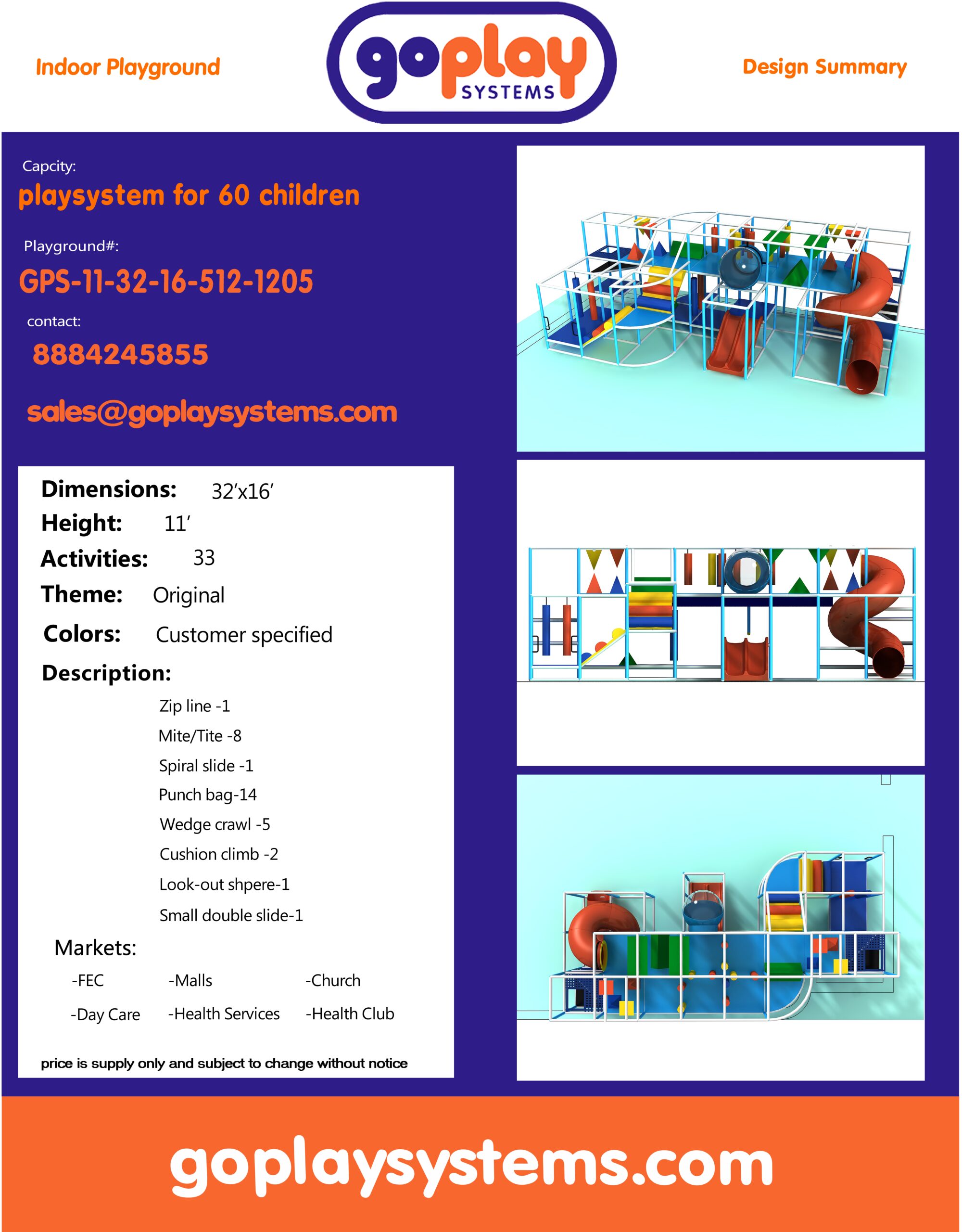 O parque infantil coberto GPS1205 é um sistema de recreação coberto personalizado para crianças de três a doze anos. A unidade de recreação com piso macio mede 9,7 m de largura por 3,3 m de altura e 4,8 m de comprimento. O espaço mínimo necessário para este equipamento de recreação infantil é de aproximadamente 11,5 m de largura, 4,9 m de altura e 6,7 m de comprimento. Área total: 46,5 m². Parque infantil coberto de tamanho médio.