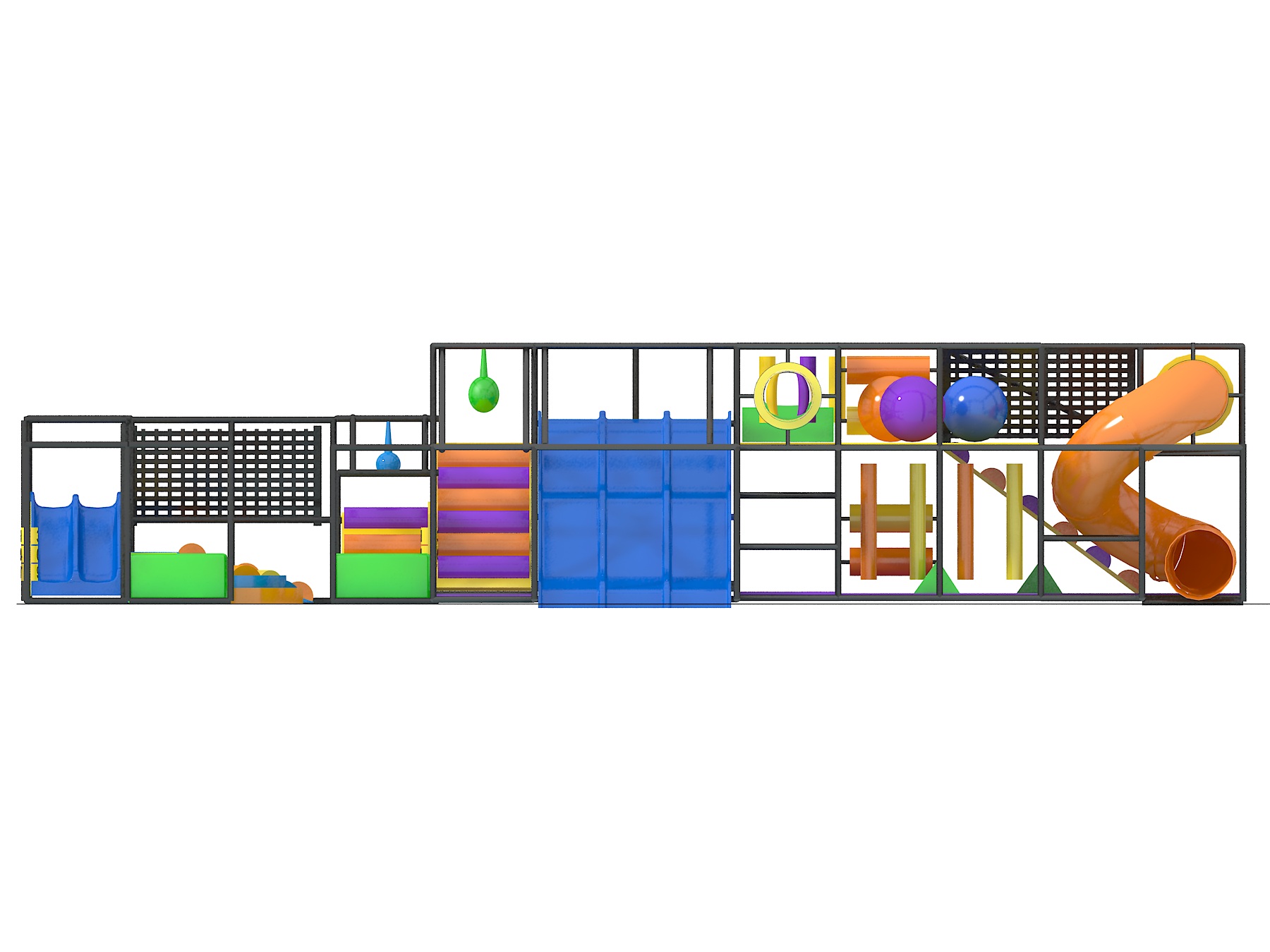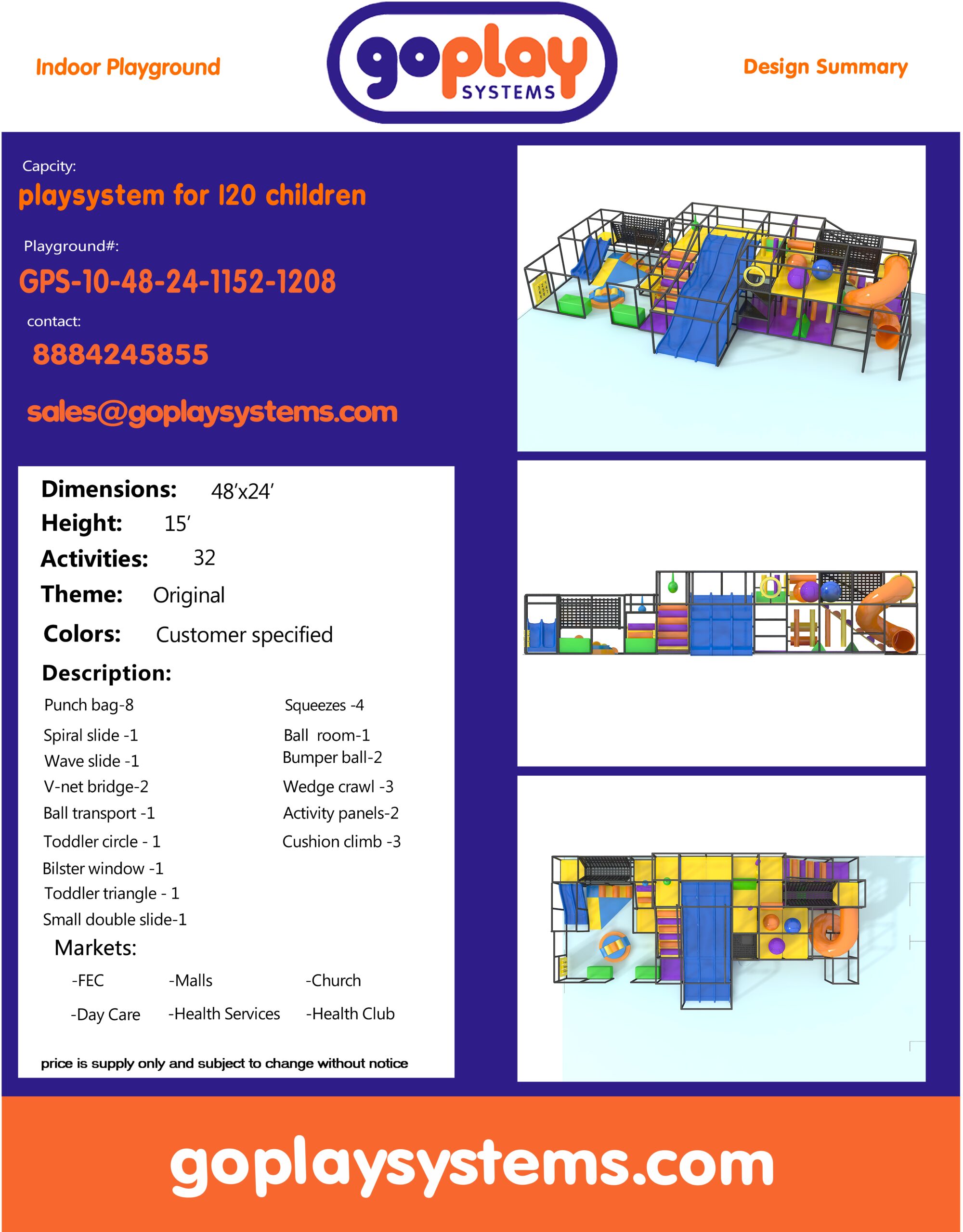 O parque infantil coberto GPS1208 é um sistema de recreação coberto personalizado para crianças de três a doze anos. A unidade de recreação com piso macio mede 14,6 m de largura por 3 m de altura e 7,3 m de comprimento. O espaço mínimo necessário para este equipamento de recreação infantil é de aproximadamente 16,4 m de largura, com pé-direito de 3,6 m e 9,1 m de comprimento. Área total: 109,6 m². Parque infantil coberto de tamanho médio.